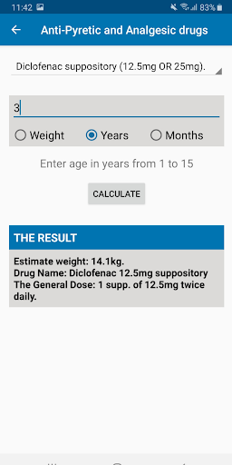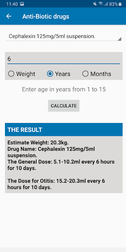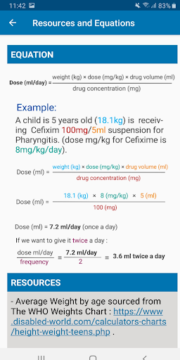 Pediatric Dose Calculator est une application pour le calcul de la dose exacte de sirop, suspension et suppositoire pour les enfants de 0 --15 ans et les adultes (supposons qu\ils pèsent plus de 45 à 50 kg) qui ne peuvent pas avaler de comprimés ou de gélules. Fonctionnalités de l\application: - Possibilité d\insérer le poids précis de l\enfant. - Estimez le poids de l\enfant en fonction de son âge selon les tableaux de poids de l\OMS. - Plus de 50 médicaments. - Classification des médicaments pour 5 groupes, antibiotiques, analgésiques et antipyrétiques, antihistaminiques et corticostéroïdes, médicaments GIT, médicaments pour les voies respiratoires. - Donner un avertissement lorsque le médicament n\est pas recommandé avant un certain âge. - Tenez compte de la dose maximale pour chaque médicament. - Selon les dernières informations 2020. - Facile et rapide à utiliser pour les médecins, les pharmaciens et les infirmières. - Contiennent la plupart des médicaments utilisés chez les enfants en Jordanie .