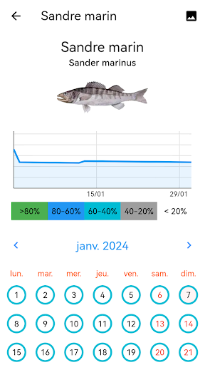 Calendrier de la Pêche \Planète des poissons\ donne une prévision précise de la réussite d\un voyage de pêche et s\adresse à tous les pêcheurs - des amateurs aux pêcheurs. Pour une prévision de pêche complet - il suffit de cliquer sur le jour qui vous intéresse. La probabilité de capture e est présentée sous une forme graphique simple pour chaque poisson. Pour la commodité de l\affichage, vous pouvez choisir d\espèces de poissons que souhaités, la désactivation de prévisions pour que les types de poissons que vous n\allez pas attraper bientôt. Les poissons sont distribués par les familles dans les paramètres Application. Dans les paramètres, vous pouvez spécifier un point sur la carte, pour laquelle vous avez besoin de regarder les prévisions. Ceci est utile lors de la planification d\un voyage de pêche - préciser un point, choisir un jour - et obtenir les prévisions. Calendrier de la Pêche peut vous informer sur les prévisions pour aujourd\hui. Notifications seront également affichés sur un gadgets, connectés à votre téléphone mobile, comme une horloge ou remise en forme des bracelets électroniques - par exemple, le Samsung Galaxy vitesse, Samsung Galaxy Fit et autres. Les prévisions sur la base du modèle mathmatical de poissons MathFish5.0 (TM), qui prend en compte: zone climatique (modèle tridimensionnel détaillé de la Terre, basée sur la topographie, l\océan permanente et les courants marins et les vents); dynamique de changement de base de la nourriture en un point donné; la caractéristique du comportement de chaque espèce de poisson - la ponte, l\alimentation, l\hiver; réaction de chaque espèce de poisson sur les phases de la lune. Pas pris en compte: impact des événements météorologiques locales sur les poissons appétit; changements quotidiens associés à lever, le coucher du soleil, lever de la lune et coucher de la lune; impact sur les marées de pêche. Le calendrier présente 199 espèces de poissons. Modèle mathématique de MathFish5.0 de poissons (TM) est développé pour chaque poisson. La version de base gratuite de l\application comprend 32 grandes espèces de poissons. Séparément disponible pour le téléchargement de paquets régionaux: Amérique du Nord - 73 espèces de poissons; Europe et Asie - 131 espèces de poissons; Mer Poissons - 124 espèces de poissons. En plus du calendrier, nous vous recommandons les pêcheurs pour installer l\application \Planète des poissons\ - poissons mobile de référence la plus complète pour les pêcheurs. Ce guide de pêche: contient des données biométriques et des descriptions détaillées des habitudes et des modes de pêche de 360 espèces de poissons et a deux versions gratuites et payantes. Calendrier de la Pêche \Planète des poissons\ - est le résultat de notre travail sur le calendrier de pêche biennales, calendrier troisième génération. Sur la pêche cette application sera très utile dans votre téléphone mobile!