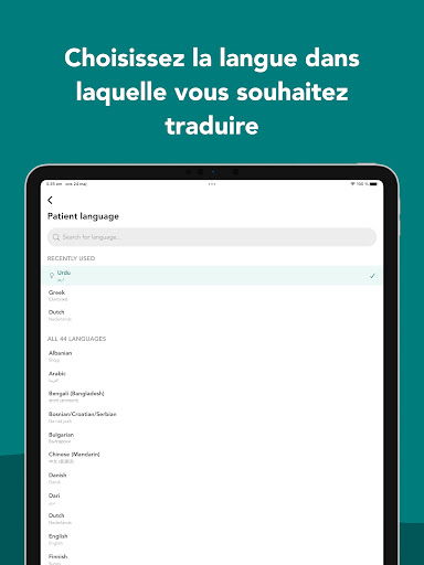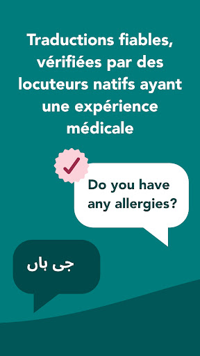 Care to Translate est un traducteur médical numérique destiné au personnel de santé et aux patients. L\application sert de complément aux interprètes humains dans le domaine de la santé et est disponible 24h/24 et 7j/7 sur votre smartphone ou votre tablette. Care to Translate peut être utilisé dans les situations d\urgence ainsi que dans le travail quotidien en milieu hospitalier. - Traductions fiables, vérifiées par des locuteurs natifs ayant une expérience médicale - Traductions médicales en audio et texte - Des playlists pour un accès facile à toutes vos phrases les plus utilisées Comment ça fonctionne: 1. Choisissez la langue dans laquelle vous souhaitez traduire 2. Utilisez nos playlists ou effectuez une recherche pour trouver des phrases 3. Appuyez sur une phrase pour afficher la traduction sous forme de texte et pour lire l\audio Traduire vers et depuis: Albanais, Arabe, Bengali (Bangladesh), Bosniaque/Croate/Serbe, Bulgare, Chinois (Mandarin), Danois, Dari, Néerlandais, Anglais, Finlandais, Français, Allemand, Grec, Hindi (Inde), Hongrois, Italien, Kurmandji, Same de Lule, Malaisien (Malaisie), Same du Nord, Norvégien, Pachto, Perse, Polonais, Portugais (Brésil, Portugal), Roumain, Russe, Somalien (Somalie), Sorani, Espagnol (Amérique latine, Espagne), Suédois, Tagal, Thaïlandais, Tigrigna, Turc, Vietnamien, Swahili (Tanzanie) Fonctionnalités: - Disponible en 40+ langues - Mode personnel de santé et patient - Accessible 24h / 24 et 7j / 7 depuis votre smartphone ou tablette - Traductions audio et texte - Audio hors connexion - Playlists organisées Utilisez Care to Translate pour communiquer sur: Soins dentaires • Ambulance • Soins quotidiens • Chirurgie • Radiologie • Gynécologie • Accouchement • Réception • Psychiatrie • Vaccination • Soins de maternité • Urgences • Tuberculose • Infection • Neurologie • Traumatisme • Violence et abus • Coronavirus • Médicaments • et plus ! Lorsque vous utilisez Care to Translate, vous pouvez réduire le risque de: - Mauvais diagnostic causé par les barrières linguistiques - Traitement inadapté du à une erreur de diagnostic - Complications dues à un manque de communication ou à une communication incorrecte - Séjours hospitaliers prolongés (les patients dont la maîtrise de la langue est limitée restent généralement plus longtemps aux urgences et à l\hôpital que le patient moyen) - Augmentation des réadmissions (les patients dont la maîtrise de la langue est limitée sont 20% plus susceptibles de demander des soins dans les 72 heures suivant leur décharge) - Augmentation des coûts en raison des raisons ci-dessus À propos de nous Care to Translate a été fondée en 2015 en tant qu\association à but non lucratif par des étudiants en médecine de l\Institut Karolinska de Stockholm. Nous résolvons le problème des barrières linguistiques en offrant des produits de pointe qui assurent une communication sûre et efficace entre les professionnels de la santé et les patients. Aujourd\hui, Care to Translate est devenu l\un des outils de traduction les plus utilisés dans le secteur de la santé suédois et nous avons plus de 700.000 utilisateurs dans plus de 200 pays. Care to Translate pour les organisations et les entreprises Care to Translate peut être adaptée à tous les services hospitaliers. Contactez-nous à info@caretotranslate.com pour plus d\informations ou visitez notre site Web. Organismes à but non lucratif Si vous travaillez pour une organisation à but non lucratif, vous avez la possibilité d\accéder gratuitement à notre application commerciale! Contactez-nous à info@caretotranslate.com pour plus d\informations. Consultez nos conditions générales sur https://caretotranslate.com/our-terms-and-conditions