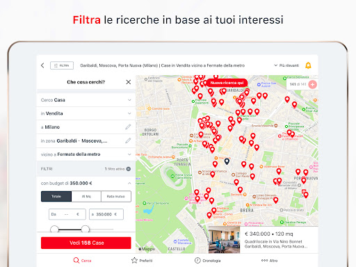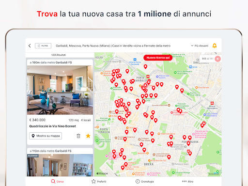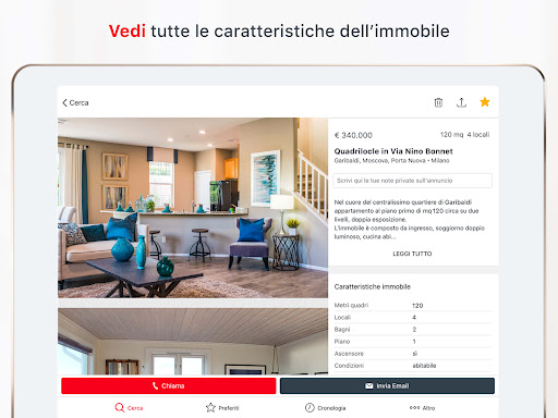 Scarica l\app di Casa.it, il primo portale immobiliare in Italia, dal 1996 il punto di riferimento per la ricerca di case in vendita e in affitto. Qualunque sia la casa che sogni, è già su Casa.it! OLTRE 1 MILIONE DI ANNUNCI • Trova la tua nuova casa tra oltre 1 milione di annunci immobiliari in vendita e in affitto in tutta Italia • Se vuoi visitare una casa senza uscire di casa, contatta l\agenzia e prenota una visita guidata con PrimaVisita • Scopri quanto vale la tua casa e pubblica GRATIS i tuoi annunci • Cerca per località, per zona o disegna sulla mappa la tua zona preferita • Cerca vicino a fermate della metro, scuole, supermercati e altri servizi che possono rendere più semplice la tua vita • Cerca le case raggiungibili in pochi minuti (in auto, in bici o a piedi) da dove vivi o dove lavori o qualsiasi indirizzo importante per te • Filtra le ricerche per categoria, tipologia, prezzo, metri quadri, numero di locali, ma non solo: cerchi una casa arredata o con l\aria condizionata? Sogni una villa con piscina? Non ti interessano le case all\asta o ancora in costruzione? Sull\app Casa.it è più semplice trovare quello che cerchi grazie ai completissimi filtri! • Ordina gli annunci per rilevanza, prezzo, data • Guarda gli annunci su mappa RICERCHE E ANNUNCI PREFERITI • Salva le tue ricerche anche da web. Grazie al tuo account Casa.it potrai trovarle velocemente anche su app • Salva i tuoi annunci preferiti e condividili con chi vuoi tramite le app di messaggistica istantanea e i Social Network • Nascondi gli annunci che non ti interessano, non riappariranno più nelle tue ricerche • Ricevi ISTANTANEAMENTE le notifiche dei nuovi annunci, appena vengono pubblicati, così da non farti sfuggire la tua casa ideale • Scrivi le tue note personali sugli annunci, saranno visibili solo a te TANTI ANNUNCI RICCHI DI INFORMAZIONI • Sfoglia la galleria delle immagini, vedi le foto 360 e scopri tutte le caratteristiche degli immobili • Contatta direttamente l’inserzionista via telefono o via e-mail • Calcola la rata del mutuo e richiedi una consulenza • Vedi sulla mappa la zona dove si trova l’immobile • Per le nuove costruzioni vedi il capitolato e tutti i dettagli del progetto Per qualsiasi segnalazione, richiesta di supporto o suggerimento, utilizza la sezione Feedback all’interno dell’app o scrivici all’indirizzo app@casa.it L’accesso all’Applicazione comporta il rispetto e l’accettazione dell’Accordo di licenza per l’uso di applicazioni, dell’informativa sulla privacy e delle altre note e condizioni che siano richiamate dalle Condizioni di Utilizzo, e loro successive modifiche e/o aggiornamenti. Per questo motivo, sei pregato di leggere con attenzione i predetti documenti prima di accedere alle Applicazioni e di consultarne il contenuto con regolarità.