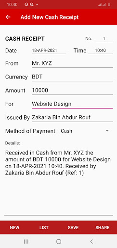 Cash Receipt App is designed to digitally acknowledge received cash from a person or company. It is an essential app for your personal and business transactions. Are you facing a problem to print expensive printed cash memos or cash receipts? Do you like to instantly acknowledge receipt of money received from your mobile phone? Are you tired of remembering how much you received from whom? We have a clear and easy solution by presenting you a very easy to use app. The app has the following features: - Date and Time of Receipt (Auto) - Unique ID - Received from (Payer) - Received by - Amount with Multi-Currency - Purpose/Description - List all Receipts - Void or Delete Receipts - Select Method of Payment (Cash/Credit Card/MFS/...) - View SMS - Add company details - Add company logo - Printing option to any printer Receipts can be saved in Image format or send via SMS or Email. Visit our website www.cashreceipt.xyz for more information. For any support or suggestions please send email to support@cashreceipt.xyz You can also stay connected with our Facebook page: https://www.facebook.com/cashreceiptandroid