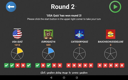 \Category Quiz\ is a quiz where the questions must be answered by category. Currently there are over 10,000 questions available! (English and German) Since Version 2.0 of Category Quiz Google Play Games is integrated which allows you to compete with players all around the world by means of a global highscore list. Another big deal is the possibility to unlock achievements and earn experience points. You need to login with your Google account to enable this new features. Version 2.1 adds the so called \Image-Questions\ where the question can only be answered with the help of a displayed image. Version 3.0 adds the multiplayer mode where up to 4 players of all around the world can match each other. If there are any problems, crashes or questions please contact me via email (categoryquiz@live.at) or on Facebook! The questions are frequently updated so that you continue to have fun with the quiz! At the moment the questions are divided into the following categories: - Sports - Entertainment - Food - Geography - Science - History - Art & Literature - People - Music - Religion - Technology - Animals - Economy - Politics - Botanical Singleplayer-Mode ================= If all questions in a category are answered correctly you get 100 extra points. If the second category is completed, you get 200 extra points, for the 3rd Category 300 extra points, etc. If a question is answered incorrectly the category gets \locked\ and no more questions can be answered in this category. If the question timer is used (can be enabled/disabled using the game options) the user has 30 seconds to answer the question. The faster the question is answered the more points you get (3 points for every remaining second). In addition the user has the possibility to get help using the 3 Jokers (50:50, stop timer, new question). If you decide to start a \quick game\ 6 categories are chosen automatically. In a \normal game\ you can choose your favorite 6 categories. Multiplayer-Mode ================ Multiplayer-Mode is not available from 03/31/20 because Google shut down the Google Play turn based multiplayer service. ! IMPORTANT! You have the possibility to enable/disable if the correct answer is shown in the case that you answer a question incorrectly in the \options\ (in addition to that you can change the timespan the correct answer is displayed).