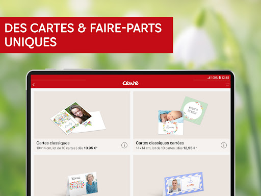 Créez et commandez vos produits photo sur l’application photo CEWE : albums photo, impressions photo, décos murales, cartes postales ou encore calendriers photo… créez partout et simplement vos produits avec vos photos préférées. Leader européen du marché de l’impression photo depuis 60 ans, CEWE a été élu « meilleur service photo au monde » par les TIPA World Awards en 2018, 2019 et 2020. Le groupe CEWE mène depuis 20 ans des actions concrètes pour améliorer sa performance environnementale et ainsi participer à la préservation de la planète et des générations futures: - CEWE compense ses émissions de carbone liées à son activité d’impression photo à travers le programme Kasigau Wildlife Corridor Project qui vise à la reforestation de 200 000 hectares de forêts au Kenya. - Tous les papiers d’impression des LIVRES PHOTO CEWE sont certifiés FSC, label qui garantit que les produits utilisés pour la fabrication du papier proviennent de ressources contrôlées et prélevées de manière responsable. DE NOMBREUSES FONCTIONNALITÉS PRATIQUES DE L’APP PHOTO CEWE - Reconnaissance des événements : pour faciliter la création, les photos de vos événements sont automatiquement détectées grâce à une lecture intelligente de vos photos. - Suggestions automatiques de LIVRE PHOTO CEWE composés avec vos meilleures photos basées sur vos temps forts : des albums photos déjà mis en page, modifiables selon vos envies. - Sauvegarde automatique : interrompez votre création à tout moment et reprenez-la plus tard. - Protection de vos données : vos données et photos sont stockées sur des serveurs CEWE en Allemagne et ne sont jamais transmises à des tiers. - Garantie satisfait ou remboursé sur les produits suivants : LIVRE PHOTO CEWE, Calendriers photo, décos murales, cartes et faire-part CEWE NOS PRODUITS COMMANDABLES SUR L’APPLICATION - LIVRE PHOTO CEWE - Tirages photo - Calendriers photo - Coques pour smartphones parmi 300 références - Décos murales : poster photo, photo sur toile, photo sur alu … - Cartes postales, faire-part… LA GAMME DE LIVRE PHOTO CEWE SUR L’APP - 5 formats au choix - 2 types de couvertures - 6 types de papiers : 3 papiers à impression digitale et 3 papiers photo - Nombre de pages : jusqu’à 202 pages pour les papiers à impression digitale et jusqu’à 130 pages pour les papiers photo. LA GAMME DE TIRAGES PHOTO SUR L’APP - Papier photo Fujifilm mat ou brillant - Tirages photo classique ou créatifs avec ou sans marge colorée… - Format fixe ou format variable au choix LA GAMME DE COQUES DE TELEPHONE SUR L’APP - Coque entièrement personnalisable avec la photo et le texte de votre choix - Compatibles pour 300 références dont les derniers iPhone et Samsung Galaxy - 9 types de coques : Premium, rigide, silicone, bois, cuir, housse… DECOS MURALES, AFFICHES ET POSTERS SUR L’APP - Grand choix de matériaux : poster photo, photo sur toile, photo sur carton mousse, photo sur alu… - Grande variété de formats CARTES & FAIRE-PARTS SUR L’APP - Une conception 100% personnalisée : textes, photos… - Cartes de vœux : format classique ou pliable - Cartes postales : 15x10 cm ou 21x10 cm - Des créations originales pour toutes les occasions : naissance, mariage, anniversaire et plus encore CALENDRIERS PHOTO SUR L’APP - Calendriers muraux A4, A3, ou carré - Calendriers de bureau carré (2 formats) - Grand choix de papiers et de styles Besoin d’aide ou d’un conseil pour créer votre produit ? Notre Service Clients sera ravi d’y répondre : Par email : contact@cewe.fr Par téléphone : 08 25 68 68 07 (0,15€/min TTC + prix d’appel) 7 jours sur 7 de 9h à 22h (sauf jours fériés)