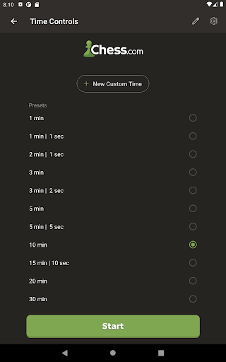 Replace your chess clock with this free game timer! It\s easy to use, yet fully featured to handle any time control. 100% free: no in-app purchases, no ads! Choose your time control and you\re ready to play. The 2nd player presses her button to start the 1st player\s clock - and the game is on! FEATURES - Large, easy-to-read buttons - Works in landscape and portrait on all devices - Quickly customize the app for one-tap access to all your favorite time controls - Time controls include base minutes per player and optional per-move delays or bonus time. The app supports both Fischer and Bronstein increments, as well as simple delays. The duration is up to you! - Supports multiple-stage time controls commonly seen in tournaments, such as \40 moves in 2 hours + game in 60 minutes.\ A glance at the clock shows your current stage! - Clock pauses automatically if the app is interrupted; manually pause the clock at any time - Pleasant sounds for buttons and \time\s up\ alert At Chess.com, we really do love chess, and *sometimes* we even play it offline! For times like that, we created this clock - and we hope you love it as much as we do.
