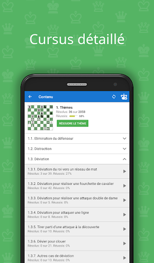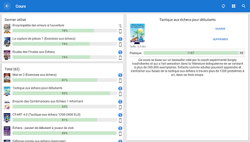 Chess King Learn (https://learn.chessking.com/) est une collection unique de cours d\enseignement des échecs. Elle comprend des cours de tactique, de stratégie, d\ouvertures, de midgame et de fin de partie, divisés par niveaux, depuis les débutants jusqu\aux joueurs expérimentés, et même les joueurs professionnels. Avec l\aide de ce programme, vous pouvez améliorer vos connaissances sur les échecs, apprendre de nouvelles astuces et combinaisons tactiques, et consolider les connaissances acquises dans la pratique. L’application fonctionne comme un entraîneur en vous proposant des exercices à résoudre et vous aide si vous n’y arrivez pas. Il vous donnera des indices, des explications et vous montrera même les coups de réfutation aux erreurs que vous pourriez faire. Certains cours contiennent une partie théorique, qui explique les méthodes du jeu à un certain stade du jeu, en se basant sur des exemples réels. Les techniques enseignées dans la partie théorique s’inspirent de parties réelles afin de garantir une mémorisation efficace. Grâce à son interactivité, vous pourrez librement tester les coups sur l’échiquier en même temps que le contenu didactique. Voici quelques points forts de l’application : ♔ Exemples de haute qualité garantis sans erreur ♔ Exercices de difficulté progressive ♔ Différents objectifs à atteindre dans les exercices ♔ Indice donné en cas d’erreur ♔ Pour les coups erronés typiques, les coups de réfutation sont montrés ♔ Vous pouvez jouer contre le moteur à n’importe quelle position dans les exercices ♔ Leçons théoriques interactives ♔ Organisation pédagogique des leçons ♔ Calcul de votre ELO tout au long de votre apprentissage ♔ Mode d’évaluation des compétences ♔ Possibilité de faire des marque-pages de vos exercices favoris ♔ L’application s’adapte à toutes les orientations et tailles d’écran ♔ Traduction en français par un vrai traducteur ♔ L’application fonctionne hors-ligne sans connexion nécessaire ♔ Vous pouvez lier l\application à un compte gratuit Chess King et résoudre un cours à partir de plusieurs appareils sur Android, iOS et Web en même temps. ♔ Dans l\application, les cours sont divisés par thèmes et niveaux, ce qui vous permet de choisir le cours le plus approprié. Chaque cours comprend une partie gratuite, dans laquelle vous pouvez tester le programme et les exercices. Les cours proposés dans la version gratuite sont entièrement fonctionnels. Ils vous permettent de tester l\application en conditions réelles avant d\acheter une version complète. Chaque cours doit être acheté séparément, mais vous pouvez acheter un abonnement qui vous donne accès à tous les cours pour un temps limité. Vous pouvez étudier les cours suivants dans l\application: ♔ Échecs : passer de débutant à joueur de club ♔ La tactique aux échecs (1400-1800 ELO) ♔ Bobby Fischer - Champion d\échec ♔ Manuel de combinaisons aux échecs ♔ Tactique aux échecs pour débutants ♔ Défense avancée aux échecs (exercices) ♔ La stratégie aux échecs (1800-2400) ♔ Intégrale des finales aux échecs (1600-2400 ELO) ♔ CT-ART. Combinaisons de Mat ♔ Combinaisons aux échecs ♔ Le Milieu de Partie aux Échecs I ♔ La stratégie aux échecs pour débutants ♔ CT-ART 4.0 (Tactique aux échecs 1200-2400 ELO) ♔ Mat en 1, 2, 3-4 (Exercices aux échecs) ♔ Tactiques simples d\échecs ♔ Encyclopédie des erreurs à l\ouverture ♔ Finales aux échecs pour débutants ♔ Études des Finales aux Échecs ♔ La capture de pièces ♔ Sergueï Karjakin - Elite joueur d\échecs ♔ Mikhail Tal ♔ Défense simple aux échecs (exercices) ♔ Magnus Carlsen – Champion d\échecs ♔ Garry Kasparov ♔ Viswanathan Anand ♔ Vladimir Kramnik ♔ Alexander Alekhine ♔ Mikhail Botvinnik ♔ Emanuel Lasker ♔ Jose Raul Capablanca ♔ Encyclo des Combinaisons aux Echecs Informant ♔ Wilhelm Steinitz