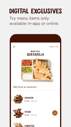 Like a tiny Chipotle that lives in your phone, our app lets you order real, delicious food for pickup or delivery. FEATURES • Pick up quicker with mobile pickup shelves and Chipotlane. • Or, get your order delivered straight to your door. • Try tasty menu items you can only get in-app or online. • Get your faves faster with saved meals and recent orders. • Go crazy with unlimited ‘extra’ ‘light’ and ‘on-the-side’ customizations. • Pay your way with Google Pay. • Start a Group Order to invite your squad in on the fun. • Save your go-to Chipotle locations and delivery addresses.