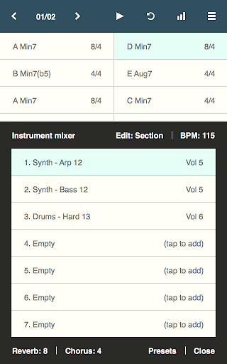 Chordbot is a music app that lets you create and play complex chord progressions quickly and easily. Use it to: * Experiment with advanced chord progressions without instruments or fingering charts. * Create customisable backing tracks for instrument practice sessions. * Rearrange new or existing songs with different instruments and comping patterns. * Experiment with music theory without having to master an instrument first. How: * Add some interesting chords * Select a few instruments patterns * Hit play. Fiddle around with chords and arrangements in real-time until you find something you like * Export as MIDI, refine in DAW, release song, profit (optional) Key features: * 60+ chord types in all keys and inversions * 400+ dynamically mixable instrument tracks * Key/inversion/root note control * Support for song sections with separate arrangements/mixer settings * Song-O-Matic - Automatic song generator with pop, jazz and experimental profiles * MIDI/WAV export This is the full version of Chordbot with all features enabled. There is also a free evaluation version (Chordbot Lite) with disabled save/export features that you could/should try before buying this version. See chordbot.com for more information and audio demos. Please report all bugs and problems to: support@chordbot.com