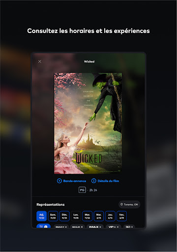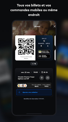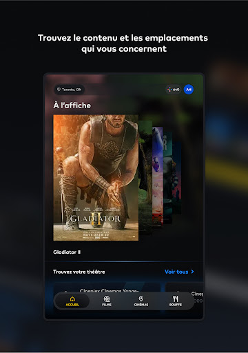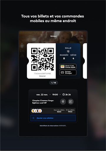 Découvrez la toute nouvelle application Cineplex améliorée : votre guide indispensable pour une expérience cinématographique ultime ! Avec les horaires des représentations, la réservation de billets, la commande de collations et bien plus encore à portée de main, préparez-vous à plonger dans un monde de divertissement. Par ici l\évasion. +Film et événements Votre prochaine évasion est à portée de main grâce à l\application Cineplex. Découvrez les dernières sorties de films et celles à venir, les films indépendants, le cinéma international, les concerts en direct, l\opéra, les documentaires, les expositions d\art, et bien plus encore. Que vous soyez un inconditionnel des soirs de première, d\opéra ou d\action, l\application Cineplex a tout ce qu\il vous faut. +Horaires et billets en toute simplicité Planifiez votre soirée cinéma en quelques clics : il suffit de trouver le cinéma Cineplex de votre choix, de consulter les horaires et d\acheter vos billets. Une fois arrivé au cinéma, scannez vos billets directement depuis l\application et passez directement au maïs éclaté! +Expériences bonifiées Passez à la vitesse supérieure grâce à des expériences haut de gamme. UltraAVX – UltraAVX offre une qualité d\image étonnamment nette avec des écrans plus grands et un son enveloppant dynamique. Haut-parleurs Dolby AtmosMC dans certains emplacements. Cinémas VIP – Profitez d\une soirée exceptionnelle dans un cinéma intime, réservé aux personnes en âge de consommer de l\alcool, avec des plats délicieux et des cocktails de marque livrés directement à votre siège. IMAX – Un son immersif et saisissant, associé à des images d\une clarté cristalline sur les plus grands écrans, qui vous transporte au-delà de l\expérience cinématographique standard. D-BOX – Parfaitement synchronisé avec l\action à l\écran, le mouvement réaliste de D-BOX vous plonge au cœur de l\action comme jamais auparavant. ScreenX – ScreenX offre une expérience panoramique à 270 degrés qui élargit le film, vous entoure d\images, remplit naturellement votre vision périphérique et vous transporte dans le film. 4DX – 4DX est une expérience cinématographique multisensorielle qui vous plonge dans le mouvement, les vibrations, l\eau, le vent, les éclairs et d\autres effets spéciaux. RealD 3D – Regardez votre film prendre vie en RealD 3D! Profitez d\une salle de cinéma grand format haut de gamme dotée de technologies cinématographiques de pointe. Représentations adaptées aux sensibilités sensorielles – Ces projections proposent un environnement lumineux et sonore aux personnes atteintes de troubles du spectre autistique et à d\autres personnes. Vedettes et poussettes – Les parents peuvent regarder les nouveautés dans un environnement adapté aux bébés, avec un éclairage doux, un volume réduit et d\autres commodités. +Obtenez-en plus Reliez votre compte Scène+ à l\application Cineplex et commencez à accumuler et à échanger des points de récompense contre des films, des repas et plus encore dans les cinémas Cineplex. Vous voulez faire passer votre amour du cinéma au niveau supérieur? Adhérez à CinéClub, le programme des amateurs de cinéma! Profitez d\avantages exceptionnels comme un billet de cinéma par mois, 20 % de rabais sur les articles aux comptoirs alimentaires, pas de frais de réservation en ligne, et bien plus encore! + Commandez à l\avance des collations à récupérer Régalez-vous à l\avance avec vos collations et friandises préférées. En commandant à l\avance, vous vous assurez que votre maïs éclaté, vos boissons gazeuses et d\autres produits classiques sont prêts et vous attendent à votre arrivée, ce qui vous permet de vous rendre plus tôt aux bandes-annonces. Alors, installez-vous confortablement dans votre siège, prenez votre maïs éclaté et vivez la magie du cinéma comme jamais auparavant. Par ici l\évasion avec l\application Cineplex.