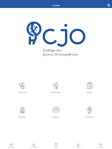 CJOrtho est une application destinée aux chirurgiens orthopédistes et aux professionnels de la santé traitant les troubles musculo-squelettiques. Développée par le Collège des Jeunes Orthopédistes, elle représente une aide à la décision et à la prise en charge des patients consultant pour un trouble musculo-squelettique. Elle facilite également l\évaluation clinique et le suivi pré et postopératoire. L\application comprend cinq outils : - les classifications les plus fréquemment utilisées en Orthopédie Traumatologie - les principaux scores cliniques par articulation pour le suivi de vos patients - un goniomètre - une database permettant de garder les informations sur les patients et de les lier aux autres outils de l\application - un portfolio permettant de suivre l\avancement en classant les procédures en \vu\, \fait\ ou \non vu\. Le Collège des Jeunes Orthopédistes www.cjortho.fr/site/