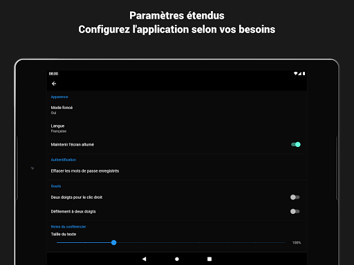 Clicker transforme votre téléphone ou votre tablette en contrôleur de présentation à distance. Nous prenons en charge tous les systèmes d\exploitation de bureau et logiciels de présentation courants. MISE EN ROUTE 1. Téléchargez et exécutez l\application Clicker Desktop (https://bit.ly/clicker-desktop) sur votre ordinateur. 2. Connectez votre ordinateur et votre téléphone au même réseau WiFi. 3. Exécutez l\application sur votre téléphone. Votre ordinateur sera détecté automatiquement. CARACTÉRISTIQUES - trouve automatiquement les ordinateurs disponibles sur le réseau local - se connecter manuellement à l\ordinateur sur le réseau distant - fonctionne tous les systèmes d\exploitation de bureau populaires - un protocole léger garantit qu\il n\y a pas de décalage lorsque vous cliquez - lire des vidéos avec prise en charge du clic de souris (trackpad à distance) - pointez sur les choses importantes avec la souris (trackpad distant) - contrôle du volume à distance (présentations avec audio et vidéo) - aperçu des diapositives - notes du conférencier - utilisez S Pen pour contrôler les présentations (nécessite S Pen 2018 ou plus récent, avec prise en charge Bluetooth) - et des actions d\ajouts prises en charge par le logiciel de présentation que vous utilisez QUESTIONS Si vous avez des questions ou rencontrez des problèmes, n\hésitez pas à écrire à l\e-mail du développeur. COMMENTAIRES Vos commentaires nous aident à améliorer l\application à chaque mise à jour. Nous vous demandons donc de bien vouloir partager avec nous ce que vous pensez de l\application ici ou par e-mail.