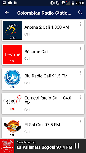 Main Features: - Listen to radio channels that broadcast on FM/AM and/or over the internet - Listen to FM/AM radio even if you are abroad - Simple and modern interface - Listen to radio in the background with control in the notification bar (play/pause, next/previous, and close) - Support for headphone control button - Save your favorite radio stations for quick access - Enjoy instant playback and premium quality - Listen without interruptions and streaming issues - Instant search to easily find your desired radio stations - Display song metadata. Find out which song is currently playing on the radio (depending on the station) - No need to connect headphones; listen through your smartphone\s speakers - Report streaming issues to improve the experience - Share with friends via social media, SMS, or email Some of the included stations are: - Radio Nacional de Colombia - Al Aire - Fuerza Aérea Colombiana - Amor Años Maravillosos - Antena 2 - Arizsanta FM Stereo Bogotá - Baladas Clásicas y Viejitas Radio - Bésame FM Armenia - Bésame FM Barranquilla - Bésame FM Bogotá - Bésame FM Bucaramanga - Bésame FM Cali - Bésame FM Cúcuta - Bésame FM Manizales - Bésame FM Medellín - Bésame FM Pereira - Bésame FM Popayán - BLU Antioquia - Boom FM - Cadena Melodia AM - Cadena Radial Vida Bogotá - Candela Estéreo - Caracol Radio - Caracol Radio Cartagena 1170 AM - Caracol Radio Deportes - Caracol Radio Ibagué - Caracol Radio Montería - Caracol Radio Neiva - Caracol Radio Pasto - Caracol Radio Tunja - Clasica 88.5 FM - Clásicos Del Reggaetón - Click Latino 99.5 FM - Colmundo Radio - Colombia Bohemia - Colombia Pop Rock - Colombia Romántica - Colombia Salsa Rosa - CRV Vida Adoración - CRV Vida Gospel - CRV Vida Latina - CRV Vida Urbana - CRV Vida y Palabra - El Sol - El Sol Tuluá 96.1 FM - Emisora Atlántico Barranquilla - Energia 102.5 FM Cali - Estrella Estereo FM - Fantástica Barrancabermeja FM - Fiesta Buga 106.1 FM - Javeriana Estéreo FM - La Cariñosa Duitama 1.030 AM - La Cariñosa Espinal 1050 AM - La Cheverisima 96.1 FM - La CrossOver 105.3 FM - La Farra Stereo - La FM Clásicos - La FM Pop Latino - La Joya FM - La Kalle - La Konsentida FM - La Maxima FM - La Mega Girardot - La Mega Villavicencio - La Ochentera FM - La Pachanguera FM - La Primerisima FM - La Reina FM - La Rumbera FM - La Salxisa FM - La Vallenata FM - La X Medellín FM - Latin Vox Radio - Latina Stereo FM - LOS40 Bogotá - LOS40 Cali - LOS40 Medellín - LOS40 Villavicencio - Madrigal FM - Mix Radio Valledupar 106.7 FM - Música Blu - Olimpica Stereo Santa Marta - Olimpica Stereo Sincelejo - Olimpica Stereo Valledupar 93.7 FM - Oriente Estéreo FM - Pereira al Aire FM - Policía Nacional Bogotá FM - Q\hubo Radio Medellin - Radio Auténtica Cali - Radio Calidad Cali - Radio Cristal Medellín - Radio HJCK - Radio Maria Colombia - Radio Múnera Eastman - Radio Paisa Medellín - Radio Planeta FM - Radio Red Bogotá - Radio Reloj - Radio Santa Fe Bogotá - Radio Tiempo - Radio Tiempo Clásica - Radio Tiempo Hit - Radio Uno Fredonia - Radio Uno Fusagasuga - Radio Uno La Ceja - Radio Uno Sogamoso - Radio Uno Villa de Leyva - Radioacktiva Medellín 102.3 FM - RCN Clásica - RCN Ochentera - RCN Radio - RCN Retro - RCN Rock y Metal - Rionegro Estereo FM - Risaralda FM - Rock Radio - RTVC Exploremos - RTVC Radiónica - Rumba FM - Rumba Caucasia FM - Rumba Lorica FM - Rumba Ocaña FM - Rumba Planeta Rica FM - Rumba Riohacha FM - Rumba San Andrés FM - Rumba Tumaco FM - Son Latino - Sonora AM - Tropicana FM - Univalle Estéreo FM - Veracruz Estereo FM - Vibra Bogotá 104.9 FM - W Radio 99.9 FM Bogotá - W+ Radio - Yo Soy Cali Rumbera - Yumbo Estereo FM and many more..! Note: - You need an internet connection to use the app. - To achieve uninterrupted playback, a suitable connection speed is recommended.