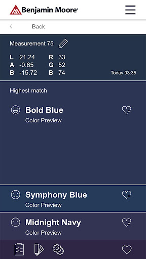 Grâce à notre application gratuite, misez sur le pouvoir de la couleur Benjamin Moore où que vous soyez. Sauvegardez des couleurs, partagez des photos et plus encore! Trouvez les bonnes couleurs de peinture (et amusez-vous en le faisant) grâce à ces fonctionnalités : ÉVENTAIL VIRTUEL - Naviguez facilement d’une collection de couleurs Benjamin Moore à l’autre, notamment Inspiration CouleurMD, les Classiques de Benjamin Moore, AffinitéMD, les couleurs historiques, la collection des blancs et les Classiques des designers. VISUALISEUR DE PHOTOS - Prenez la photo d’une pièce et « essayez » instantanément des couleurs en appuyant sur une surface pour la dissimuler, ou utilisez des photos de notre galerie d’inspiration. VISUALISEUR DE VIDÉOS - Découvrez la réalité augmentée en appliquant des couleurs Benjamin Moore sur les surfaces de votre choix en temps réel. APPARIEMENT DE COULEURS PRÉCIS - À l\achat de l\appareil Benjamin Moore ColorReader ou ColorReader Pro par Datacolor, vous pouvez apparier toutes les couleurs en temps réel aux couleurs dans notre bibliothèque. Pour commander un appareil, accédez au site datacolor.com/bmorders.