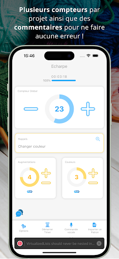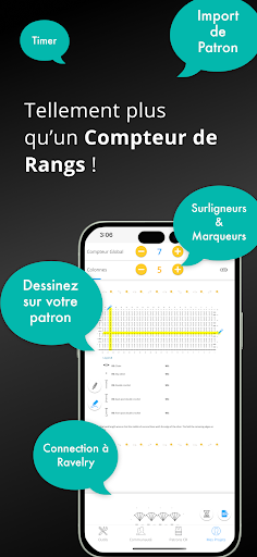 Appli Compteur de Rangs optimisée pour le tricot & le crochet: ___ IMPORTEZ VOTRE PATRON ___ # Téléchargez votre patron, qu\il soit sur un blog, un site internet ou sous format PDF. Il s\affiche directement dans votre compteur. # Fan de Ravelry ? Vous pouvez accéder au site en 2 clics et chercher un patron sur le site ou parmi vos favoris. __ UN COMPTEUR PARFAITEMENT ADAPTÉ ___ # Vous pouvez ajouter plusieurs compteurs simultanément & ainsi suivre vos diminutions, vos motifs ou encore vos changements de couleur # Bandes de surlignage horisontale et verticale, pour suivre facilement votre PDF. # Surligneur multi-lignes pour marquer les informations importantes de votre patron, ou mettre en avant la taille que vous suivez. # Ajoutez des annotations à votre PDF. # Ajoutez des notes à votre compteur, celles-ci apparaîtront au bon moment ! # Juste besoin d\un compteur basique : Vous pouvez également l\utiliser sans aucune configuration. # Ajoutez des annotations à votre patron PDF, utilisez le surligneurs pour ne pas perdre votre ligne. ___ CONTRÔLE VOCAL ___ # Dites juste à l\appli \étape suivante\ et le compteur s\incrémente de lui-même. Plus besoin d\interrompre son tricot ! __ SUIVEZ VOS PROGRÈS ___ # L\Appli vous indique à tout moment combien de rangs & de mailles vous avez tricoté, ainsi que le temps passé sur chaque projet. __ MODE NUIT ___ le mode nuit est appliqué lorsque votre téléphone est en mode nuit, mais vous pouvez aussi utiliser comme mode par défaut ou le désactiver. ANDROID WATCH (Wear OS) Si vous avez une montre Android compatible avec Wear OS, vous pouvez contrôler l\app depuis votre poignet !