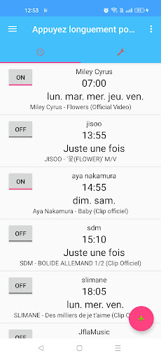 Il est le réveil en utilisant la vidéo de YouTube. Si le temps lorsque vous définissez il est venu, YouTube commence. Vous pouvez choisir vos chansons préférées de YouTube. Il commence même si vous définissez dans les modes d\économie d\énergie plus android6.0. Pourquoi ne pas essayer de se réveiller propre dans le chant matinal de votre choix? Lorsque les ondes radio ne peuvent pas atteindre Lorsque les ondes radio ne parviennent pas sera un réveil intégré retentit. Lorsque le réglage du volume est éteint Lorsque le réglage du volume est désactivé, Alarme Refroidir change le volume de celui-ci automatiquement et jouer de la musique À ceux qui ne travaillaient pas avec une autre application de réveil Un menu pour arrêter le mode Doze a été ajouté. Si vous arrêtez le mode Doze, l\application sera lancée à l\heure souhaitée dans tout Android.