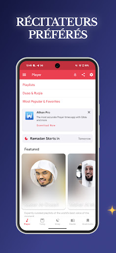 Coran Pro est un concentré des meilleurs récitateurs du Coran dans le monde. Un design de l’interface utilisateur simplifié et ergonomique avec une panoplie de nouvelles fonctionnalités. L’application Quran Pro est l’application la plus populaire et la plus performante pour écouter le Coran en qualité HD et sans aucune interruption. Prenez une minute chaque jour pour découvrir et apprendre le verset du jour. Coran Pro est une application gratuite sans aucune limitation au niveau de l’écoute. Avec l’application Coran, vous pouvez: • Écoutez votre récitant préféré directement à partir de votre poignet grâce à l\application Watch. • Multitude de récitateurs Ecoutez le Coran récité par plus de 60 récitateurs (cheikh) parmi les plus connus à travers le monde. • Traduction Lisez le Coran en arabe accompagné de sa traduction (français, anglais, malais, néerlandais, italien, espagnol ou même avoir les explications et le tafsir). Nous supportons 30 langues au total. • Favoris Vous pouvez ajouter les sourates ou les récitateurs dans votre liste des favoris à partir de la fenêtre de lecture. • Mode sans connexion internet Téléchargez des récitations, des listes de lecture et des pistes, et apportez le Quran partout avec vous en mode hors ligne (sans connexion internet). Téléchargez une sourate ou plusieurs à la fois. • Liste de Lecture Créez votre liste de lecture personnalisée du Coran, en les ajoutant simplement à partir de votre liste de lecture de chaque récitateur. • Partage Partagez le verset du jour avec vos amis par messagerie ou sur les réseaux sociaux. • Multiplateformes Notre application Quran Pro est également compatible avec les technologies de pointes comme Android TV et Android Auto. • Caractéristiques audio Ecoutez le Coran sur notre application en arrière-plan pendant que vous utilisez votre appareil Android. Les fonctions de répétition, de lecture aléatoire et de minuterie sont également incluses • Widget L\application propose un widget qui répertorie vos audios récemment écoutés. - Écoutez votre récitant préféré directement à partir de votre poignet grâce à l\application Wear OS. • Design L\application a été redesignée pour être plus rapide, plus simple, plus ergonomique et plus agréable. En plus d\être optimisée pour Android material design. NOTE IMPORTANTE : L\application nécessite une connexion Internet avec WiFi ou 3G / 4G pour une utilisation au cas où vous n\avez pas téléchargé les sourates ou les récitateurs à l’avance. Nous publions régulièrement des mises à jour et nous sommes en permanence à la recherche de fonctionnalités innovantes pour notre application. Si vous avez des commentaires, des remarques ou si vous rencontrez des problèmes ? S\il vous plaît contactez-nous directement sur notre adresse de support à partir des réglages de notre application ou consultez notre aide en ligne. Android TV et Android Auto sont des fonctionnalités logicielles et des marques déposées par Google. N’hésitez à nous encourager et nous soutenir notre le développement de notre application Quran et Athan Pro barakallahoufikoum, en nous laissons votre avis sur l’Appstore. لا تنسون من صالح الدعاء Je demande humblement Allahu taâla de nous accorder la sincérité dans l\intention et sa miséricorde et d\unir tous les musulmans sous la bannière du prophète Mahomet et que nous soyons parmi les gagnants au Jour du Jugement. Amine Téléchargez Quran Pro aujourd\hui et profitez de l\écoute des meilleurs récitants du monde. Politique de confidentialité: https://quranpro.co/privacy Conditions d\utilisation: https://quranpro.co/terms