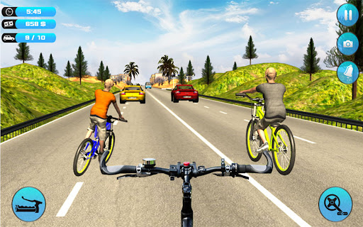 Bicycle Rider Traffic Racer 2017 est la forme la plus récente de course sur route et a le plus grand nombre de concurrents sur la route, les événements et les spectateurs. Préparez-vous à faire du vélo et à profiter d\une incroyable course de vélos autour de la belle ville avec une circulation importante. Ce simulateur de vélo 2017 vous offre une expérience de conduite cycliste extrême et rapide sur un vélo de luxe. Les animations mélangées des accidents de bicyclette et des cascades de vélo 2017 vous donnent une sensation réaliste de conduite en bicyclette et une expérience de conduite héroïque. Rencontrez votre passion pour les courses de vélo avec les meilleurs coureurs de vélo du monde entier pour se battre pour la course de championnat de vélo ultime de 2k17. Utilisez-vous des compétences de course de vélo supérieures pour battre tous les cavaliers de la circulation routière; Gagnez des niveaux ultimes et stimulants, gagnez de l\argent pour acheter de nouveaux cycles à partir du magasin virtuel de sélection de cycle. Prenez les autres et recréer votre énergie, ravitaillez nitro en choisissant des packs de boost et profitez des courses sur route avec des manèges rapides! Jouez à la ronde éliminatoire contre tous les cavaliers adverses pour profiter de la véritable essence des courses de vélo en mode Knockout. Créez votre carrière de course en complétant toutes les missions difficiles et émergez en tant que véritable champion de vélo. Vous n\avez pas encore joué à ce genre de jeux cycliste. Donc résidez l\exclusivité en téléchargeant GRATUITEMENT ce vélo Rider Traffic Racer 2017, votre vélo combiné avec la personne. C\est votre temps d\afficher l\audace et la responsabilité requises pour conduire ces bicyclettes étonnantes.