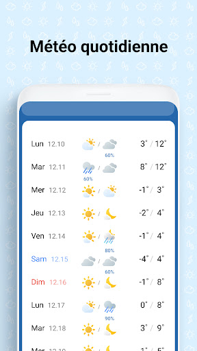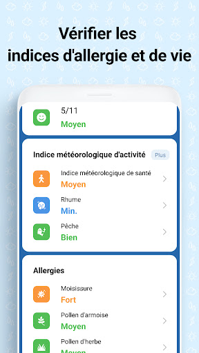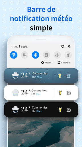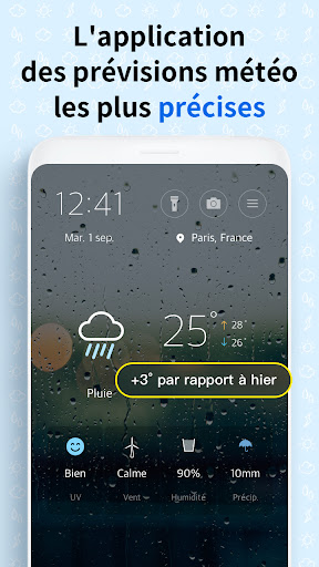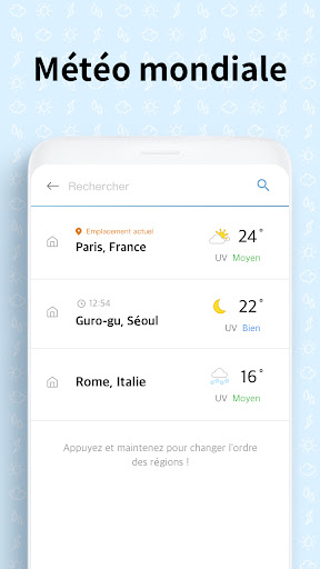 Fournit des informations météo précises et à la minute près. Comparez la météo d\aujourd\hui avec celle d\hier pour coordonner vos habits. Préparez-vous à l\avance grâce au radar météorologique et aux avertissements de typhon. Informations météo principales Météo actualisée pour votre lieu de résidence Vérifier la météo dans d\autres régions Température à la minute près Rayons UV à la minute près Humidité à la minute près Probabilité et volume des précipitations à la minute près. Vitesse/direction du vent à la minute près Météo à la minute près Vent, carte météo à la minute près Point de rosée, pression atmosphérique, visibilité à la minute près Widgets météo divers Écran Météo propose divers [widgets météo]. Il existe plus de dix styles et fonctions différents, alors regardez par vous-même ! Caractéristiques d\Écran Météo Vous donne des informations météo et même sur le décalage horaire Des animations météorologiques réelles et vivantes ! Très mignon La météo et les températures par rapport à hier Fonctionnalité d\alerte météo Affiche la météo sur la barre de notification Fonctionnalité de widget Vérifiez les informations météo du monde entier sur votre écran de verrouillage Supporte les informations nationales et régionales dans le monde entier. Informations plus utiles Indice d\allergie [Arbres, pollen d\herbe, pollen d\armoise, etc...] Indice météorologique d\activité [Ski, hydratation, plage et piscine, migraine, moustiques, pêche, randonnées, voile, etc.] Rayons UV Heures de lever/coucher du soleil Prévisions météo pour 10 jours Fonctionnalité utile de Premier Temps Utilisez votre lampe torche et votre appareil photo directement à partir de l\écran de verrouillage. . . . ※Avis sur les autorisations de Écran Météo 2 Pour garantir une utilisation fluide du service, les autorisations suivantes sont nécessaires. Veuillez noter que ces autorisations ne seront jamais utilisées à d\autres fins que celles mentionnées ci-dessous. [Autorisations obligatoires] Afficher sur d\autres applications : Fournit des informations sur l\écran principal du téléphone. [Autorisations facultatives] *Vous pouvez utiliser l\application sans accepter les autorisations facultatives. Notifications : Utilisation de la barre de notifications et réception des mises à jour météo Position : Paramétrer la position actuelle pour recevoir des informations météo Autorisation de localisation (Optionnel) L\accord pour utiliser l\emplacement est requis pour les paramètres de région. Autorisation Caméra (Optionnel) L’autorisation de la caméra (flash) est requise pour utiliser la fonction lampe torche.