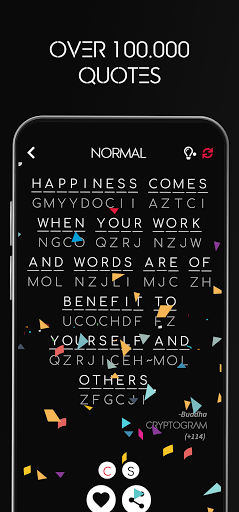Voici Cryptogram, un jeu de réflexion gratuit où l’objectif est de décrypter des citations célèbres! Les cryptogrammes sont créés en remplaçant les lettres réelles par des lettres différentes. Si vous aimez lire des citations et résoudre des énigmes, ce jeu est fait pour vous! Vous pouvez sélectionner des citations de vos auteurs et catégories préférés. Certaines des fonctionnalités intéressantes: • Quatre niveaux de difficulté • Vous pouvez sélectionner des cryptogrammes entre différentes catégories et auteurs ou simplement résoudre les plus populaires. • Partagez les citations que vous avez résolues avec vos amis. • Des milliers de citations, des centaines d\auteurs et bien plus sont à venir! • Sélectionnez la couleur qui vous correspond entre +7 combinaisons de couleurs différentes! • Gardez une trace des puzzles que vous avez résolus et définissez-les comme favoris • Astuces lorsque vous êtes coincé • Conception épurée