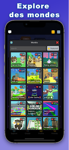 Bienvenue sur Cubzh, la plateforme ultime de contenu de jeux créés par les utilisateurs (UGC) où la créativité n\a pas de limites ! Plonge-toi dans l\univers de Cubzh avec des centaines d\expériences uniques et plus de 30 000 objets voxel, tous créés par une communauté passionnée de développeurs et d\artistes. Que tu sois un joueur, un créateur, ou que tu veuilles juste t\amuser avec des amis, Cubzh offre des possibilités infinies—et tout ça gratuitement ! EXPLORER UNE INFINITÉ DE MINI-JEUX Découvre une grande variété de jeux, des aventures épiques aux défis rapides. Que tu préfères jouer en solo ou en équipe avec des amis, il y a toujours quelque chose de nouveau à découvrir. Avec Cubzh, tu ne t\ennuieras jamais. Rejoins des jeux de tous les genres comme la simulation, la simulation de véhicules, les casse-têtes, les puzzles, les jeux de plateformes, les FPS et les RPG dès maintenant. EXPRIME TA CRÉATIVITÉ Le moteur de jeu et l\API de scripting Lua de Cubzh rendent le développement de jeux simple mais puissant. Les artistes peuvent donner vie à leurs idées grâce à l\éditeur intégré d\objets voxel pour concevoir des skins et des objets uniques. Que tu sois expérimenté ou débutant, Cubzh te fournit tous les outils pour exprimer ta créativité. RENCONTRE DES AMIS Fais de nouvelles rencontres ou retrouve d\anciens amis sur Cubzh. Joue, discute et explore des mondes avec tes amis. Cubzh est ton hub social pour te connecter à une communauté mondiale de joueurs et de créateurs. Partage des aventures, collabore sur des projets, et crée des amitiés pour la vie ! PERSONNALISE TON AVATAR Exprime-toi avec ton avatar ! Choisis parmi une vaste bibliothèque de tenus et de skins pour créer un avatar qui te ressemble vraiment. Mélange les styles, des tenues décontractées aux costumes uniques, et démarque-toi dans chaque jeu auquel tu joues. DISPONIBLE SUR TOUTES LES PLATEFORMES Emporte l\expérience Cubzh partout avec toi. Profite d\un jeu multiplateforme fluide, que tu sois sur ton appareil mobile ou ton ordinateur. Joue avec des amis à tout moment, n\importe où ! CARACTÉRISTIQUES DE CUBZH Des centaines de jeux créés par la communauté : Des possibilités de jeu infinies créées par des utilisateurs comme toi. Outils de création de jeux puissants : Développe des jeux rapidement grâce à l\API de script Lua de Cubzh (le même langage que dans Roblox). Outils de script visuel et sans code : Bientôt disponibles pour satisfaire tous les créateurs de jeux. Éditeur d\objets voxel intégré : Conçois et partage tes propres objets, des vêtements aux objets uniques dans le jeu. Personnalisation illimitée des avatars : Des milliers d\options pour personnaliser ton avatar et montrer ton style. Hub social : Discute, fais-toi des amis, et joue ensemble dans une communauté en ligne dynamique. Des cubes partout : Dans Cubzh, tout est fait de cubes. Les terrains, les maps, les avatars, les objets, les véhicules... rendant la création accessible à tous ! Importer et exporter des modèles : Depuis des formats courants, y compris MagicaVoxel (.vox). Fabrique des objets et des mondes : Fabrique et construis ton propre monde à partir de blocs voxel. Cubzh est GRATUIT : Super léger et fonctionne partout (appareils mobiles et ordinateurs de bureau ainsi que navigateurs web). Application tout-en-un : Pour tous les types d\utilisateurs, les joueurs et les créateurs se croisent dans la même application, pas besoin de télécharger d\autres applis ! Multi : Serveurs multijoueurs en temps réel gratuits. Éditeur de code intégré : Écris du code et corrige les bugs directement depuis ton téléphone si tu veux ! Rejoins la communauté Cubzh aujourd\hui et commence à créer, jouer et explorer dès maintenant ! L\aventure t\attend ! LIENS UTILES DISCORD : cu.bzh/discord SUPPORT : cu.bzh/support DOCS DÉVELOPPEURS : docs.cu.bzh POLITIQUE DE CONFIDENTIALITÉ : cu.bzh/privacy CONDITIONS D\UTILISATION : cu.bzh/terms