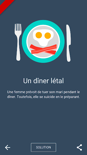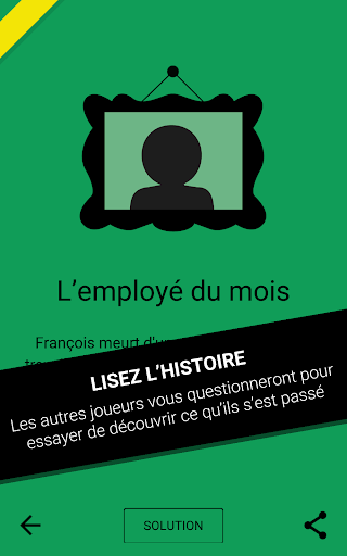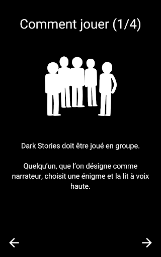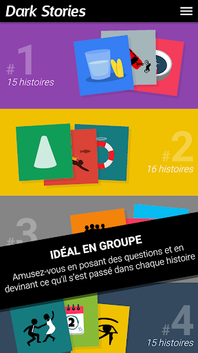 ATTENTION ! CE JEU A ÉTÉ CONÇU POUR ÊTRE JOUÉ À PLUSIEURS ET EN PERSONNE. SI VOUS ÊTES SEUL(E) VOUS NE POUVEZ PAS JOUER ! Dark Stories est un jeu facile et amusant à jouer mais certaines histoires sont assez compliquées. Toutes les histoires sont fictives. Pour les résoudre, les joueurs vont devoir faire appel à leurs talents de détectives. COMMENT JOUER Dark Stories doit être joué en groupe. Quelqu’un, que l’on désigne comme narrateur, choisit une énigme et la lit à voix haute. Ensuite, il-elle lit la solution, qu’il garde pour lui-elle. Les autres joueurs doivent ensuite poser des questions pour résoudre le mystère. Le narrateur, peut répondre aux questions uniquement par “Oui”, “Non” ou “C’est hors-sujet”. La seule solution est celle proposée par le jeu. Si tous les éléments ne sont pas suffisamment clairs, les joueurs devront se fier à l\interprétation de la solution par le narrateur. EXEMPLE Voila à quoi pourrait ressembler un moment de jeu : Joueur nº1 : ” Est-il mort par balle?” Narrateur : ”Non” Joueur nº2 : ”Est-ce qu’il a été empoisonné?” Narrateur : ”Non” Joueur nº3 : ”Est-ce qu’il avait des enfants?” Narrateur : ”C’est hors-sujet” Joueur nº1 : ”Est-ce qu’il y a d’autres personnes dans l’histoire?” Narrateur : ”Non” Joueur nº2 : ”S’est-il suicidé?” Narrateur : ”Oui” ... FIN DU JEU Quand le narrateur considère que l’énigme a été suffisamment résolue, il peut terminer la partie et lire la solution complète. Le narrateur peut décider de donner des indices s’il voit que les joueurs sont trop perdus. QUAND JOUER? Ce jeu est parfait pour les fêtes d’anniversaire, les feux de camps… et tous les moments passés entre amis. ENIGMES Cette application est gratuite et inclut plus de 200 histoires et nous en ajouterons au fur et à mesure. Remerciements à Stanislav Guskov, Arno, Baptiste, Maxime Kuchard, Lodoïs, Hugo Rosales, Rémi Tacquet, Bastien Zaram, Maëlle Collin et Jade Durenne pour leur contribution à la traduction française du jeu.