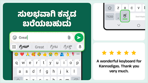 Kannada Keyboard is an English to Kannada keyboard app that makes typing Kannada faster than ever before. - Type in English to get Kannada letters - Works inside all apps on your phone - a Kannada typing keyboard app for all social media and messaging apps - Saves time compared to handwriting input or other Indic Kannada input tools. - Chat with your friends and family with this Kannada Keyboard English to Kannada - Easily search and open apps installed on your phone and discover new apps relevant to you with our App Search feature. Installation and set up is easy. - Download the app and open it. - Enable Kannada Keyboard in Step 1 and choose it in Step 2. - Change settings and choose from colourful Kannda keyboard themes. - That\s all! You can type Kannada everywhere now. - To change keyboard easily, press and hold the space key. Built in India. Amazing features. - Type in Kannada faster. Start typing the letters and choose Kannada predictions from the list. This is the easiest app for English to Kannada typing - Top words are available offline in the fast keyboard. Turn on internet for additional words. - A phonetic Kannada transliteration keyboard that works on Android phones and tablets. Kannada text typing made faster. - No need to learn Kannada keypad and layout. - The best rated Kannada typing app that works as Kannada English keyboard - This English to Kannada key board is easier to use than any other keyboard Simple and easy to use. - Use the language button to switch between English and Kannada. English word suggestions are also available. - For GIFs and emojis, click the button on top left side of the keyboard. Make your conversations even more amazing with popular animated GIFs - Press and hold the emoji key to view all emojis from the Kannada emoji keyboard - Kannada GIF keyboard lets you share interesting good morning messages, funny animations and more. - Color themes can be changed from settings. Choose from 21 interesting color combinations. Love it? Choose Premium. - Buy Premium on this Kannada Keyboard for Android for a small one time cost for a fully ad free experience. - Your purchase supports the developers and helps improve the app even more. We respect your privacy. - No personal information or credit card details are collected. A standard warning is shown by Android for all keyboards that you download. - Anonymous statistics may be collected to improve your experience. Share your suggestions by emailing us at apps@clusterdev.com Please leave great feedback - it helps us keep going!