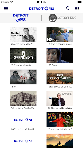 Detroit PBS: The Detroit Public Television App allows you to explore and watch Detroit PBS content on demand, search for stories and view the live program schedule for all the Detroit Public Television stations at once! Live Schedules • Integrated program schedules for every station. On Demand • Access and watch your favorite Detroit PBS On Demand programs easily and quickly. • DVR-like controls. Pause, rewind and fast forward your program with ease. • Easy to access past programs. The Detroit PBS App is brought to you by the people at Detroit Public Television and Public Media Apps. We work to provide our valued listeners with great solutions to find what you want, when you want it, and where you want it. Please support Detroit Public Television by becoming a member today! http://www.dptv.org http://www.publicmediaapps.com