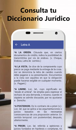 El diccionario jurídico español más completo Ponemos a tu disposición este diccionario jurídico en el que hay recogido los principales textos jurídicos y su significado. Constituye un ambicioso proyecto de compilación de términos jurídicos. El propósito de este diccionario es particularmente didáctico, proporcionando al usuario respuesta a las dudas que puedan surgirle, en el desempeño de su actividad lectiva o profesional, acerca del significado de algún término jurídico. Se denomina abogacía al trabajo, la función o la tarea del abogado. Un abogado, por otra parte, es el profesional en Derecho que se dedica a brindar asesoría jurídica o que defiende o representa a una de las partes en un proceso judicial. Además, es estupendo para mantenerse al tanto de las últimas noticias jurídicas y estar siempre informado sobre cualquier tema. Está creado para servir como instrumento tanto del estudiante como también del profesional que permanentemente debe recurrir a la determinación precisa de la terminología legal. El propósito del diccionario jurídico es ofrecer al usuario respuesta a sus dudas sobre el significado de la terminología jurídica La aplicación se compone de: + Diccionario jurídico español: para consultar cualquier término que necesites. + Noticias jurídicas: mantente informado en todo momento de las últimas noticias jurídicas + Diccionario online: consulta en la red multitud de definiciones y términos nuevos + Humor jurídico: un poco de humor para completar la aplicación con temas jurídicos de fondo. + Extras El Diccionario Jurídico se integra por términos de la doctrina, legislación y jurisprudencia. Muchas veces de manera intencional y otras tantas no, los autores de obras jurídicas definían conceptos, que quedan extraviados en un universo de letras. Esta herramienta tiene como finalidad rescatar y sistematizar todos estos conceptos, además de relacionarlos con los términos que definen el legislador, y el juez en la jurisprudencia. El diccionario jurídico español es ideal y perfecto para llevar siempre en tu smartphone y consultarlo Muy bueno para abogados y estudiantes de derecho ya que te permite buscar cualquier término jurídico. * Si tienes cualquier cuestión o duda o deseas contribuir en algo, por favor, háznoslo saber. Gracias. Descarga ahora Diccionario Jurídico Español y comparte con nosotros tu experiencia