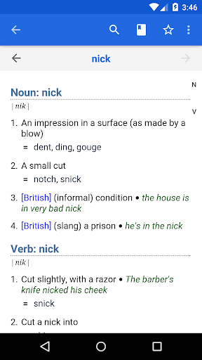 The free offline English dictionary and thesaurus with synonyms, related words and great search - and no adverts. Audio pronunciations are available with the separate Audio Edition app. The comprehensive WordWeb dictionary database includes: - 285,000 words, phrases and derived forms - 225,000 word sense definitions - 70,000 usage examples - 85,000 text pronunciations - Synonyms, similar and related words - N. American, British, Australian and international English The intelligent word entry suggests possible correct spellings as you type, as well as listing words that sound the same or are often confused. Additional features include the ability to drill down on any word in a definition, full bookmark support and history. Search features include: - Alphabetical listing - Spelling suggestions - Sounds-like and often-confused - Fast pattern-matching search (*, ?, vowel and consonant) - Filter search results by noun, verb, adjective, adverbs The database includes proper nouns and common abbreviations in addition to English vocabulary (e.g. LOL, Oxford, JPEG, Webster, UNHCR, etc.) You can quickly look up words from within other apps by selecting the word, then selecting WordWeb from the pop-up menu (requires Android M and higher). No Internet connection is required to use WordWeb, and it\s free. Better than dictionary.com? - judge for yourself!