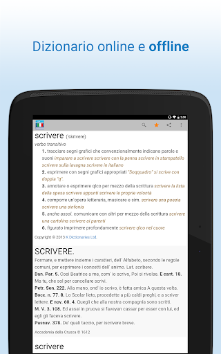 Cerca vari dizionari Italiano e un dizionario dei sinonimi, tutti dalle fonti più affidabili. * 62,000+ definizioni in Italiano. * 52,000+ parole disponibili nel dizionario offline. * Visualizza le coniugazioni dei verbi. * Ascolta l\audio di pronuncia delle parole. * Crea segnalibri senza limiti. * Opzioni di ricerca avanzate. * Condividi l ue parole preferite tramite social networks, email e sms. Come stiamo andando? Farlex è leader in prodotti di risorse online. Lavoriamo coi migliori editori per assemblare contenuti affidabili nelle apps di risorse più comprensive e autorevoli del mercato. La nostra app principale è The Free Dictionary (TFD), offerta da TheFreeDictionary.com.