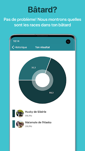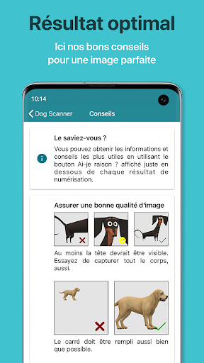 L\application Dog Scanner détermine automatiquement la race du chien à partir d\une photo ! Vous pouvez également tourner une courte vidéo de votre chien ou télécharger une photo de votre galerie. C\est un bâtard ? Pas de problème, l\application Dog Scanner reconnaît également les hybrides et vous fournit des données intéressantes sur les différentes races. Pas de chien en vue? Peu importe ! La reconnaissance des chiens fonctionne également pour les humains : il suffit de vous scanner, scanner vos amis, votre famille ou les personnes de votre environnement et de découvrir à quels chiens vous ressemblez le plus ! ------ NOUVEAU ! Faites partie de notre communauté Dog Scanner ! Partagez vos résultats et comparez-les aux résultats de la communauté ! Téléchargez des photos de votre chien préféré dans notre Social Feed et partagez-les avec d\autres amoureux des chiens ! Regardez les profils et les photos des autres utilisateurs, aimez et commentez les messages de notre communauté canine et filtrez-les par date ou par popularité ! De plus, vous pouvez facilement partager vos messages avec vos amis en envoyant simplement une photo directement depuis l\application Dog Scanner. ------ NOUVEAU ! Rassemblez toutes les races de chiens et devenez un expert ! Rassemblez toutes les races grâce à la nouvelle fonction de gamification - comme dans Pokémon Go ! Maîtrisez les défis, gagnez des gâteries virtuelles et devenez un véritable expert en matière de chiens ! Faites concurrence à vos amis et aux utilisateurs de la communauté du scanner pour chiens et grimpez en haut de notre liste de classement ! ------ Toutes les races de chiens dans une seule application ! Avec plus de 370 races de chiens différentes, l\application Dog Scanner comprend toutes les races officiellement reconnues par la Fédération Cynologique Internationale (FCI) et bien d\autres encore ! Donnez-nous votre avis sur l\application Dog Scanner ! Indiquez-nous dans l\application si la race de chien a été correctement identifiée. Si ce n\est pas le cas, on vous donnera des conseils utiles pour améliorer votre propre résultat. Si vous nous indiquez également quelle race de chien figure sur votre photo, l\application apprendra automatiquement à vous donner des résultats plus précis. Sécurisez votre surclassement de prime ! Avec notre version premium, vous ne verrez plus de publicité dans l\application et obtiendrez vos résultats encore plus rapidement. Désormais, vous pouvez également choisir si les races de votre chien doivent être reconnues particulièrement rapidement ou avec une précision particulière. En outre, vos scans sont également possibles en mode hors ligne avec la version premium. Vous n\avez donc plus besoin d\une connexion internet pour identifier les races de chiens. L\achat volontaire de la version premium de l\application vous permet non seulement de bénéficier de nombreux avantages, mais aussi de soutenir cette application. ------ Suivez-nous sur les médias sociaux ! Sur nos canaux de médias sociaux, nous vous fournissons régulièrement les plus belles photos de chiens de la communauté. Vous trouverez également de nombreux faits intéressants sur le meilleur ami de l\homme. De plus, nous vous tiendrons bien sûr au courant des dernières nouvelles dans l\application de scanner de chiens. * Instagram : https://www.instagram.com/dogscanner_app * Facebook : https://www.facebook.com/DogScannerApp * Twitter : https://twitter.com/dogscanner_app ------ Essayez le Dog Scanner ! La reconnaissance des chiens n\a jamais été aussi facile ! Donc, avant d\envisager de commander un test ADN coûteux, il suffit de scanner rapidement le chien avec l\application et la race du chien sera automatiquement identifiée en quelques secondes ! Téléchargez l\application Dog Scanner maintenant gratuitement !