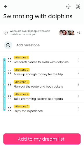 Dreamers can change the world. When was the last time someone asked you what your dream is? It\s no secret that we all have one. The problem is that we\re not doing much to make that dream a reality. Most of us lack motivation and are stuck in a rut. So how do you get out of it? Dreemz - the app that helps you with goal setting, provides inspiration, and boosts your motivation! Join a global community of dreamers who are chasing their passion and making their dreams a reality. When you download Dreemz, a groundbreaking AI-based social network, you become empowered by other dreamers who are helping one another achieve their highest aspirations and supporting each other\s personal growth. Once you sign up, the magic begins! Start by expressing your dream in a few words. Do you want to swim with dolphins or run your first marathon? Would you like to become a professional dancer, open a business, or fulfill your lifelong dream of becoming a chef or social influencer? Maybe you\ve always wanted to skydive but need a bit of encouragement or you\ve secretly wanted to become a designer but didn\t know how to get started. Whatever the dream, we\re here to support you as you make it your reality. Believe us, dreams come true with the right mindset and positive thinking! After briefly describing your dream, you\ll receive AI-generated milestones from a milestone generator to get you started. Breaking down the steps to success will help you visualize your journey to dream manifestation and realization of your goals. You\ll also get connected with other users who can help make your dream come true and who share the same dream as you, providing a strong social support system. Now you\re in it to win! Become part of a thriving community of dreamers by pitching your dream in a short video and then start documenting your journey. It\s like TikTok for dreams! Get the help, inspiration, and motivation you need from others and help them fulfill their dreams as well! Help and motivate other users and earn Dreemz Coins, and reward others who encourage and help you as you move forward on your journey to realizing your dream. Celebrate your achievements together! If that\s not enough to help kickstart your dream, our AI-powered mentor will send you daily tips and step-by-step guidelines to motivate you to hit your goals and realize your dream! You\ll also receive daily motivation videos to keep your energy and passion high! The app lets you track and document your progress, celebrate your milestones, helps you overcome setbacks, improves your time management, and gives you easy access to a wealth of resources that will help fuel your personal growth and ignite your creativity. Now, that\s enough about us. Let\s talk about you! Tell us your dream. Download the app now and take your first step toward making your dream come true. Your success story starts here!