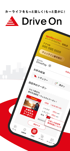 Drive Onはあなたのカーライフを便利にするアプリです。 いつもの給油をお得にし、カーライフを便利に。さまざまな役立つ機能であなたのドライブをもっと楽しく! ※クーポン配信・対応サービスは、店舗により異なります。 ※各機能は、「Drive On」対応店舗のみでご利用可能です。 ≪対応店舗は順次拡大中です≫ 【Drive Onでできること】 ■決済サービス モバイルDrivePay お財布いらず。スマホひとつでかんたん給油! スマートな給油体験を提供します。 ■クーポンがもらえる 給油やカーメンテをお得に利用できるクーポンがもらえる! ■お得なキャンペーンに参加 来店や各種サービスの利用で、素敵なプレゼントが当たるキャンペーンを随時実施中! ■カーメンテを簡単予約 洗車や車検、オイル交換など、カーメンテ予約サイトと連携することで、様々なカーメンテが簡単に予約できる! ■カーメンテ時期をお知らせ 忘れがちなカーケアの予約日や車検日などを、適切なタイミングでお知らせ! ■ドライブスポットを紹介 あなたの生活圏にあるドライブスポットを紹介。いままで気づかなかった発見や新しいドライブの楽しみ方が見つかるかも! 【Drive Onの使い方】 使い方は、カンタン3STEP! ■Step1 いつものお店をマイ店舗登録 My idemitsu IDを登録して、お好みの店舗をマイ店舗設定すると、様々な便利機能が使えます! ■Step2 お得なクーポンをつかう アプリに届いているクーポンを「つかう」設定するだけ ※クーポン配信・対応サービスは、店舗により異なります。 ■Step3 給油前にチェックイン 給油機の画面から「Drive On」を選択して、給油機のリーダーにDrive Onの会員証のQRコードをかざす チェックインと同時に「つかう」設定しているクーポンの特典が受けられます 【決済サービス モバイルDrivePayについて】 ■DrivePay/EasyPay(キーホルダー型決済ツール)をお持ちの方 ・「DrivePay/EasyPayの連絡カードまたは伝票」、「運転免許証」を用意のうえDrive Onでお手続きください。 ■DrivePay/EasyPay(キーホルダー型決済ツール)をお持ちでない方 ・クレジットカードと運転免許証をご用意いただき、DrivePay/EasyPayを発行しているお近くのサービスステーションまでご来店ください。 【さらに出光ならではのサービス!】 モバイルDrivePayや出光のクレジットカードのご利用でランクアップ! ランク毎に得られる特典でカーライフがもっと楽しく! Drive Onに加えてぜひ出光のお得なサービスをご利用ください! 【ご留意事項】 ・本アプリは全ての端末について動作保証するものではありません。機種やOSによっては正常にご利用いただけない場合がありますので予めご了承ください。 ・タブレット端末は動作保証対象外とさせていただていております。