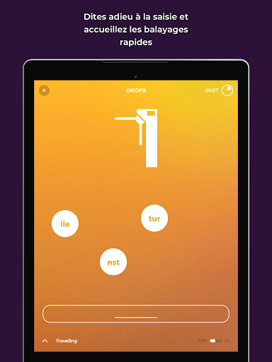 Vous êtes-vous déjà amusé en apprenant une nouvelle langue ? Maintenant oui ! Drops est une méthode d’apprentissage de langue qui change la donne – de manière littérale. Nous avons enlevé « ennuyant » du vocabulaire de l’apprentissage ! Seulement 5 minutes par jour : Drops limite votre temps d\apprentissage à 5 minutes. Cela peut sembler fou, mais cela fonctionne comme un charme. L’apprentissage d’une nouvelle langue peut parfois être accablant, mais en en le réduisant à des sprints de 5 minutes, le blocage initial est inexistant. Pas d’excuses. Vous avez TOUJOURS 5 minutes ! La contrainte de temps induit une concentration stupéfiante qui améliore encore plus l’efficacité de la mémorisation. Apprentissage 100 % visuel : Chaque petit mot est joliment illustré. Vos yeux apprécieront les délicieuses photos et votre cerveau stockera les nouveaux souvenirs plus efficacement : vous n’aurez pas à utiliser le mot de votre langue natale, mais à connecter les nouveaux mots à l’illustration de leur signification. Plus rapide, mieux, et plus amusant ! Apprentissage sans effort : Nous nous sommes penchés en détails sur la raison pour laquelle les jeux sont si amusants et addictifs, et nous avons injecté leur essence dans Drops, pour créer non pas une application d’apprentissage « jeuifiée », mais un véritable jeu à part entière ! Elle est monstrueusement immersive, mais dans notre cas vous ne perdez pas votre temps à jouer, mais développez plutôt un atout précieux : la connaissance d’une nouvelle langue. À base de glissements : Nous pensons qu’un rythme rapide est essentiel, et l’écriture au clavier est tout sauf rapide. Dites bonjour aux glissements et aux appuis rapides ! Vous aurez besoin de ces secondes supplémentaires pour tirer le meilleur parti de vos 5 minutes ;) Sélection de vocabulaire stratégique : Le « quoi » est peut-être plus important que le « comment ». Nous avons choisi à la main 2700+ mots utiles que vous utiliserez vraiment lorsque vous, disons, voyagerez dans un pays où votre nouvelle langue est parlée. Forge des habitudes d’apprentissage : Drops veut vous convertir en un accroc de l’apprentissage. Qu’importe l’efficacité de votre outil d’apprentissage, si vous ne l’utilisez pas de manière quotidienne, cela n’a pas vraiment d’importance. Drops trompe votre cerveau et vous vous en sortirez mieux grâce à cela ! Je suis sûr que vous aimerez Drops autant que nous avons aimé le concevoir. Si c’est le cas, veuillez nous laisser une évaluation afin que nous puissions rendre Drops encore meilleur ! ----------------- Vous avez des questions ? sup@languagedrops.com Politique de confidentialité et Conditions d’utilisation : http://languagedrops.com/privacypolicy.html