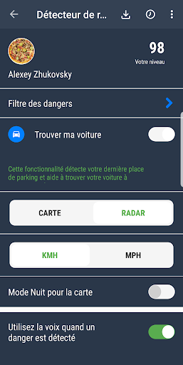Cette application est utilisée pour détecter les dangers réels sur la route, tels que les caméras de vitesse (embuscade mobiles, radars statiques, les caméras aux feux rouges), des ralentisseurs, mauvais état des routes et etc Bonnes nouvelles ! L\application prend en charge les montres intelligentes sur WearOS COMMENT COMMENCER À TRAVAILLER AVEC LE PROGRAMME? 1. Si vous venez d\installer l\application que vous aurez besoin de \Refresh dangers de base de données\ pour télécharger et installer la dernière base de radars pour votre région (pays). 2. Pour exécuter le mode de détection de danger, appuyez sur le bouton vert \Démarrer\. en bas à droite de l\écran. 3. L\application prend en compte et en informe seulement sur les dangers qui sont le long de votre itinéraire. 4. Paramètres, vous pouvez appeler, faites glisser le bord gauche de l\écran vers la droite. 5. dangers filtre que vous voulez vous faire découvrir peut appeler en faisant glisser depuis le bord droit de l\écran vers la gauche. 6. Pour ajouter un nouveau danger, appuyez sur votre doigt sur le taux d\image au bas de l\écran. ================= À partir de la version 2.0 de l\application, l\utilisateur peut se connecter à la communauté de l\application (à l\aide de votre compte Google). Les utilisateurs enregistrés ont plus d\autorisations pour gérer les objets POI (danger) sur la carte, par exemple, l\utilisateur peut supprimer explicitement les POI non pertinents de la base de données commune. ================= La dernière version prend en charge tous les pays du monde! N\importe quel utilisateur peut ajouter de nouveaux risques pour la base de données partagée. Utilisateur peut également influer sur la cote de danger (lorsque l\utilisateur obtenir alerte de danger, il peut définir s\il ya danger ou pas en fait). L\application joue le son et montre danger sur la carte et la distance à ce danger. Le flux de production de la demande diffère du détecteur de radar de matériel. Matériel détecteur de radar - est un récepteur passif qui ne bloque pas le signal auquel il est fixé, mais simplement informer le conducteur de la présence dans le domaine de l\interférence radio de radar. Cette application fonctionne différemment, il utilise une base de données des risques détectés précédemment par d\autres utilisateurs. Par exemple, si la demande est informé embuscade mobile, cela signifie que, à ce stade peut probablement être embuscade mobile. Si vous êtes connecté à Internet, vous serez en mesure de surveiller les embouteillages. Il existe une fonction de mettre à jour la base de données des risques. L\application peut fonctionner en arrière-plan (même lorsque l\écran est éteint), juste activer l\option \Utiliser la parole quand danger détecté\. ======================= Soyez prudent sur la route et bonne chance! ======================= Voulez-vous obtenir des droits de modérateur pour «Radar Detector»? S\il vous plaît, email: lelic.dev@gmail.com