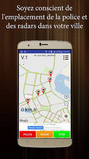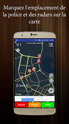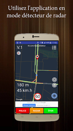 Avec l\application \Détecteur de Police\, vous pouvez marquer l\emplacement des radars et des patrouilles de police sur la carte, ainsi que voir leur emplacement marqué par d\autres utilisateurs de l\application. Vous pouvez également marquer les événements de la route comme les accidents de la route, les réparations de la route, le contrôle du poids et demander l\aide des autres utilisateurs de l\application si vous avez un problème sur la route. Les principaux avantages de l\application \Détecteur De Police\: * Complétement gratuit * Aucune inscription nécessaire * Affiche les radars et les patrouilles de police (si elles sont marquées par d\autres utilisateurs) * Affiche les embouteillages * Fonctionne en mode détecteur de radar * Affiche les limites de vitesse sur les sections de route à proximité des radars et des patrouilles de police (si les limites de vitesse sont introduites par les utilisateurs)