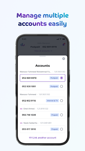 Enjoy the easiest way to manage your accounts and services, with features customised just for you. Get things done your way in just a few clicks on the du App: - Check your consumption and balance - Pay or recharge your line - Pay or recharge for a friend - Check for special offers - Change your plan - Purchase data and roaming add-ons - Purchase our products - Manage your accounts - Get chat support - Book an appointment to visit the nearest du store We update our app regularly to always meet your needs so you can always get things done your way. Enjoying our app? Rate us or write a review.