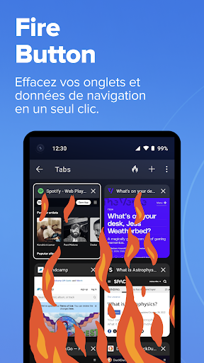 Marre d\être suivi(e) en ligne ? Nous pouvons vous aider. DuckDuckGo est l\application de confidentialité tout-en-un qui permet de protéger vos activités en ligne. Profitez d\un nouveau navigateur qui vous offrira au quotidien une protection contre les traqueurs tiers lorsque vous effectuerez des recherches et naviguerez sur le Web, et même une protection contre le tracking provenant des emails et des autres apps de votre appareil. Avec DuckDuckGo, la confidentialité va de soi. PRINCIPALES FONCTIONNALITÉS Vos recherches web incognito– La fonction DuckDuckGo Private Search est intégrée pour vous permettre d\effectuer des recherches sur le Web sans être traqué. Échapper aux traqueurs de sites Web avant leur chargement– empêchez automatiquement le chargement de la plupart des traqueurs cachés (scripts tiers), ce qui empêche les entreprises de recueillir et d\utiliser (par ex. vente, publicités, etc.) les données de ces traqueurs. Navigation cryptée – Smarter Encryption oblige les sites que vous visitez via DuckDuckGo à utiliser une connexion chiffrée (HTTPS) dès que possible, protégeant ainsi vos données des regards indiscrets. Bloquez les traqueurs mails (en version beta)– 70% des e-mails vous traquent lorsque vous les ouvrez. Activer Email Protection est le moyen le plus simple de bloquer ces traqueurs et de masquer votre adresse sans changer de fournisseur. Protégez votre vie privée des autres applications – De jour comme de nuit, bloquez les traqueurs cachés dans d\autres applis et empêchez les entreprises tierces de s\immiscer dans votre vie privée grâce à App Tracking Protection. Nous proposons également de nombreuses protections qui ne sont pas disponibles sur la plupart des navigateurs, notamment la protection contre le suivi des liens, le suivi Google AMP, etc. CONTRÔLES QUOTIDIENS DE LA CONFIDENTIALITÉ Avec le Fire Button, effacez vos traces Vos onglets et vos données de navigation disparaissent en un seul clic. Signalez vos préférences de confidentialité avec GPC Intégré à l\appli, Global Privacy Control (GPC) vous aide à appliquer automatiquement votre droit de retrait pour la collecte de vos données. Une fois GPC activé, les sites Web ne pourront pas vendre ni partager vos informations personnelles conformément aux cadres juridiques (p. ex. CCPA, RGPD) mis en place dans différents pays. Découvrez-en plus à ce sujet et sur nos protections contre le suivi sur https://help.duckduckgo.com/privacy/web-tracking-protections/ Inutile d\attendre pour reprendre le contrôle de votre vie privée. Rejoignez les millions de personnes qui utilisent DuckDuckGo et protégez bon nombre de vos activités quotidiennes en ligne grâce à une seule application. La confidentialité, simplifiée.