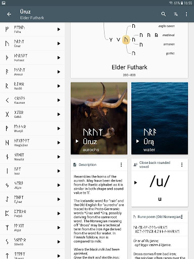 Convertissez votre nom en runes! Avec cette application, vous pouvez translittérer le texte en runes basé sur une traduction phonétique. Cette application traduit les sons des mots, pas le sens. C\est aussi une bonne source pour la prononciation des runes et pour en savoir plus sur les alphabets runiques. Soutient les grandes familles runiques suivantes: • Anciens runes de Futhark (Common Germanic Fuicark) • Suédois-Norvégien Fuþąrk (Rök; Younger Futhark) • danois Furąrk (Younger Futhark) • alphabets de runes médiévales • Les runes inventées par J. R. R. Tolkien pour Cirth (le script des runes du Hobbit / Lord of the Rings) Prend en charge Ogham (Old Irish): • Aicme Beithe / hÚatha / Muine / Ailme • Forfeda (les lettres ajoutées plus tard) Pour les utilisateurs premium: • runes anglo-saxonnes (Fuþorc anglo-frison) • Vieux turc (script Göktürk / script Orkhon / Orkhon-Yenisey) • vieilles runes hongroises (rovásírás) • runes d\Armanen (Armanen Futharkh) • gothique • Vieux italique • phénicien Le texte est transcrit en runes basées sur une représentation phonétique (anglais, russe ou agnostique de la langue).