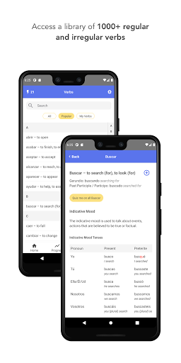 Guided levels to master all 16 Spanish tenses and cover 2,300+ verbs with short daily practice. Ella learns and focuses on your weak spots so you get fluent faster! Hola! We are an Irish couple (Jane and Brian) living in Spain and learning Spanish. We started Ella Verbs as we were looking for a way to improve our Spanish verbs and make the jump from intermediate to advanced Spanish speakers. We tried many ways to improve our Spanish grammar (books, apps, tutors – you name it, we tried it!), but never found the one that clicked. So we built it! We aren’t your typical Spanish flashcards or verb trainer app. Our philosophy is “learn, quiz, repeat”. We teach you, then quiz you and then surface content again when you need it most. It’s been proven that quizzing helps with concentration, identifying gaps in knowledge and long term retention (Roediger & Karpicke, 2006). You’ll enjoy our Smart Quizzes to drill verbs into your memory! Because it\s just the two of us, we personally read and respond to every feedback email and review. So if you have an idea, issue, question or whatever, please get in touch! We really want and listen to your feedback, and regularly release new features and improve existing ones (to date we\ve released 30+ updates per year!). Together we want to help everyone learning Spanish to master their verbs :) You can reach us in-app, or by emailing us at jane@ellaverbs.com or brian@ellaverbs.com. Looking forward to hearing from you! Features: * 30 levels (6 for free) and 8 milestones (2 for free) with bite-sized lessons and Spanish conjugation quizzes, guiding you through 16 tenses to master Spanish verb conjugation. * Verb tables of 2,300+ verbs (101 for free), with *full* English translation, synonyms and highlighting of irregulars. You can even search by conjugation! * Track your progress across multiple devices and stay motivated with a daily streak. * Step-by-step conjugation guide when you get a verb drill answer incorrect. * Estimates your CEFR level (e.g. A1, A2, B1, B2, C1, C2) so you have an idea of where you stand. * Get daily smart quizzes personalized to your level and progress (Pro only). * Speaks the answers aloud to help you with pronunciation (on supported devices only – uses built in voice library) * Supports both European (including \vosotros\) and Latin American Spanish. * Build your own quizzes with our highly customizable quiz builder (Pro only). * Create your own custom list of verbs to study (Pro only). * Access all content offline so you can study anywhere! * Dark mode and many configuration options. * Measure your CEFR level. Perfect for students practising for GCSE, Leaving Certificate, SAT Spanish, DELE (Diplomas de Español como Lengua Extranjera) and CELU (Certificado de Español: Lengua y Uso). Ella covers 16 Spanish verb tenses across 3 moods: * Indicative present (El Presente) * Indicative present continuous (El Presente Progresivo) * Indicative present perfect (El Futuro Próximo) * Indicative preterite (El Pretérito Perfecto) * Indicative imperfect (El Pretérito Indefinido) * Indicative past perfect (El Pretérito Imperfecto) * Indicative informal future (El Pretérito Pluscuamperfecto) * Indicative future (El Futuro Simple) * Indicative future perfect (El Futuro Perfecto) * Indicative conditional (El Condicional Simple) * Indicative conditional perfect (El Condicional Perfecto) * Subjunctive present (El Presente de Subjuntivo) * Subjunctive imperfect (El Imperfecto Subjuntivo) * Subjunctive present perfect (El Pretérito Perfecto de Subjuntivo) * Subjunctive past perfect (El Pretérito Pluscuamperfecto de Subjuntivo) * Imperative (affirmative & negative) (El Imperativo – afirmativo y negativo) Please note, by using Ella Verbs you agree to our terms (https://ellaverbs.com/terms) and privacy policy (https://ellaverbs.com/privacy). Learn more about us on https://ellaverbs.com.