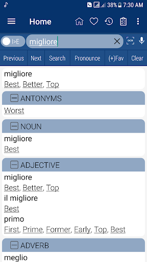 English - Italian Dictionary Experience a comprehensive, offline, and free Italian to English and English to Italian dictionary. This versatile tool is designed to make word searches seamless and efficient, whether you’re online or offline. Designed for convenience and learning, this app is perfect for students, professionals, and anyone looking to bridge the gap between Italian and English languages. Key Features: • Offline Access: Search Italian and English words anytime, even without an internet connection. • Two-Way Search: Seamlessly switch between Italian to English and English to Italian translations. • OCR (Optical Character Recognition): Easily extract and search text directly from images. Just capture or upload a photo, and the app will identify and translate the words for you. Perfect for reading signs, books, or handwritten notes! • Integrated with Other Apps: Use the dictionary directly from your browser or other applications via the sharing option. Select \Italian Dictionary\ from the sharing menu, and it will open with the shared word—no need to type! After use, you’ll return to your previous app. • Custom Themes: Choose from different themes to personalize the app’s appearance. Whether you prefer a light, dark, or colorful design, the app adapts to your style. Learning and Productivity Features: • Study Tool: Add words to a personalized study plan and review them anytime to strengthen your vocabulary. • Word Games: Engage with fun vocabulary-building games like quizzes and challenges. • MCQ (Multiple Choice Questions): Test your knowledge with interactive quizzes and track your progress. • History & Backup: Access your search history and back up your data to ensure you never lose your learning progress. • Speech to Text: Use voice search to find words quickly without typing. • Synonyms and Antonyms: Enrich your understanding of words with related and opposite terms. Ease of Use and Accessibility: • Auto-Suggestion: Get real-time word suggestions as you type. For users with low-performance devices, the option to disable this feature ensures a smoother experience. • Quick Access: A convenient dictionary icon in the notification bar allows you to launch the app instantly. • Search from Images: Extract text from images using OCR, making the app especially helpful for students and professionals. • Customizable Themes: Switch between themes to enhance readability and match your preferences. Additional Features: • No Internet Required: Fully functional offline for uninterrupted learning and searching. • Sharing and Copying: Share words and meanings with friends or copy them for use in other applications. • Pronunciation Assistance: Hear word pronunciations for better language learning. Perfect for All Devices: Discover the Best Way to Learn. This app combines the practicality of a dictionary with the fun of learning tools, games. With its OCR feature, customizable themes, and extensive word database, this dictionary is more than just a tool—it’s your partner in mastering Italian and English.