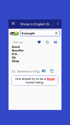 English to Xhosa and Xhosa to English offline dictionary. Also show available meaningful picture with word meaning. User-friendly interface and easy searching system. App Features: Word definition and example sentence Show meaningful picture with word meaning Auto history and bookmark word Synonyms & antonyms of words Voice pronunciation, voice search No needed internet connection