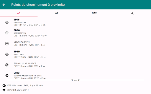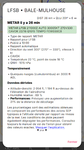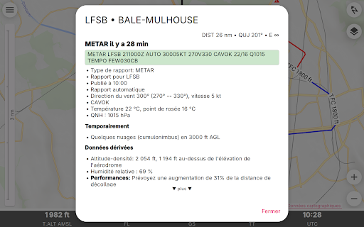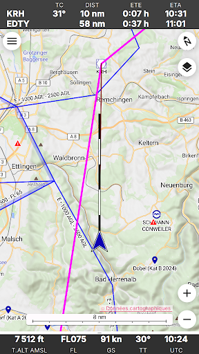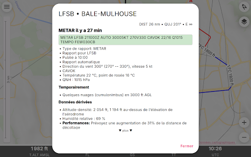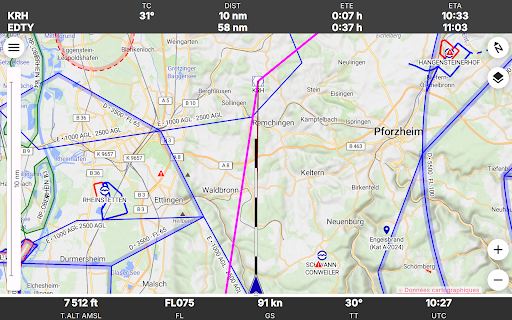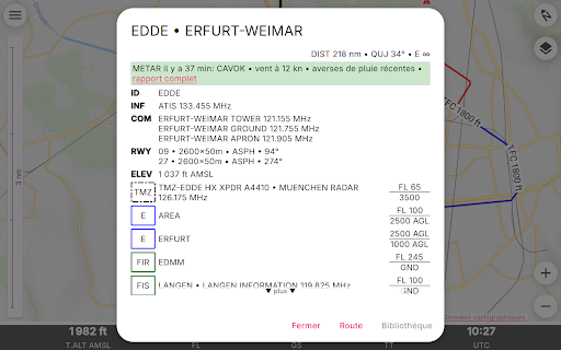 Enroute est une application de navigation de vol non commerciale écrite par des passionnés de vol pour les pilotes VFR. Conçue pour être simple, fonctionnelle et élégante, elle élimine le stress de votre prochain vol. Enroute présente une carte mobile dont le style est similaire à celui des cartes officielles de l\OACI. Votre position actuelle et votre trajectoire de vol pour les cinq prochaines minutes sont indiquées, ainsi que votre itinéraire de vol prévu. Une simple pression vous donne toutes les informations sur les espaces aériens, les aérodromes et les aides à la navigation - avec les fréquences, les codes, les élévations et les informations sur les pistes. Nos cartes aéronautiques sont gratuites, font l\objet de mises à jour hebdomadaires et couvrent une grande partie du monde. Certaines cartes montrent également les circuits d\aérodrome et les procédures de vol pour les zones de contrôle. Enroute permet la planification essentielle des vols. L\application vous permet de calculer rapidement et facilement les distances, les trajectoires et les caps. Elle vous donne une estimation du temps de vol et de la consommation de carburant. Si le temps se gâte, l\application vous indique les aérodromes les plus proches pour l\atterrissage, avec les distances, les directions, les informations sur les pistes et les fréquences. Il n\y a pas de publicité ni de version commerciale \pro\ de l\application. Nous ne vous espionnons pas. Vous n\avez pas besoin de vous inscrire pour devenir \membre\. Et nous ne vous importunons pas avec des e-mails. Nous n\avons même pas besoin de, et nous ne voulons pas, votre adresse ! Clause de non-responsabilité : nous publions cette application gratuite en espérant qu\elle puisse être utile comme aide à la navigation prudente. Elle n\est assortie d\aucune garantie. Elle peut ne pas fonctionner comme prévu. Les données ne proviennent pas de sources officielles et peuvent être incomplètes, périmées ou incorrectes. Cette application ne remplace pas une bonne préparation du vol ou un bon pilotage. S\y fier comme principal moyen de navigation est très probablement illégal, indubitablement stupide et potentiellement suicidaire.
