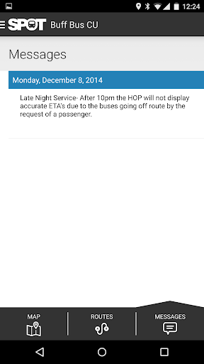 With up-to-the-second arrival prediction, route planning, and system alerts, SPOT from ETA Transit Systems is a must-have mobile app for any rider of select transit agencies. Simple to use and incredibly accurate, SPOT allows riders to select and compare multiple routes, view all current and upcoming arrival times, and receive communications regarding system outages, delays, and other critical information on any internet-enabled Android smartphone or tablet. • Works on Android phones and tablets • Functional for multiple settings including: Public Transportation, Universities, Shuttles, Demand-Response (Paratransit), Rail, and Streetcars. • For use with supported agencies only (see below for complete list) Supported SPOT-enabled agencies currently include: • Altamont Commuter Express • University of Colorado Boulder (CU) • Cheyenne Wyoming Transit Program (CTP) • Florida Atlantic University (FAU) • Miami Trolley • Texas Medical Center (TMC) • University of Houston (UH) • University of Wisconsin-Platteville (UWP) • University of Texas-Dallas • University of Texas-Health • Virginia Commonwealth University (VCU). Notes: An active Internet connection is required. The SPOT app is a free download. Support: Please report any issue with app performance via the in-app reporting feature, or by contacting support@etatransit.com. To add your transit agency to the list of SPOT providers, visit www.etatransit.com or call (719) 453-0250.