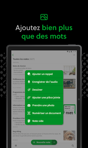 Capturez des idées lorsque l\inspiration se présente. Rassemblez vos notes, tâches et calendriers pour faire face aux distractions du quotidien et gagner en productivité, chez vous, au bureau et partout ailleurs. Evernote se synchronise sur tous vos appareils pour vous permettre de rester productif pendant vos déplacements. Avancez dans votre liste de tâches, connectez votre Google Agenda pour garder un œil sur votre calendrier et accédez rapidement aux informations les plus importantes grâce au tableau de bord personnalisable de l\Accueil. « Utilisez Evernote pour conserver tous vos documents… ne vous demandez pas sur quel appareil ils se trouvent : tout est dans Evernote » – The New York Times « Evernote est un outil indispensable pour prendre toutes sortes de notes et faire avancer vos projets. » – PC Mag --- CAPTUREZ DES IDÉES • Écrivez, collectez et capturez des idées sous forme de notes, carnets de notes et listes de tâches pouvant faire l\objet de recherches. • Ajoutez différents types de contenus à vos notes : texte, documents, PDF, croquis, photos, audio, captures Web, etc. ORGANISEZ-VOUS • Gérez votre liste de tâches avec la fonctionnalité Tâches : paramétrez des dates d\échéance et des rappels pour ne jamais manquer une échéance. • Connectez Evernote et Google Agenda pour réunir vos notes et votre calendrier. • Accédez instantanément à vos informations importantes dans le tableau de bord de l\Accueil. CONSULTEZ-LES OÙ QUE VOUS SOYEZ • Synchronisez automatiquement vos notes et carnets de notes sur n\importe quel Chromebook, smartphone ou tablette. • Commencez à travailler sur un appareil, puis continuez sur un autre appareil sans perdre de temps. EVERNOTE AU QUOTIDIEN • Tenez un journal pour organiser vos pensées. • Libérez-vous des papiers en numérisant vos reçus et vos documents importants. EVERNOTE EN ENTREPRISE • Tenez tout le monde informé en capturant des notes de réunion et en partageant des carnets de notes avec votre équipe. • Rassemblez les personnes, les projets et les idées grâce aux espaces partagés. EVERNOTE DANS L\ENSEIGNEMENT • Gardez un œil sur vos notes de cours, vos examens et vos devoirs pour ne pas passer à côté d\éléments essentiels. • Créez des carnets de notes pour chaque classe et veillez à ce que tous les éléments soient organisés. --- Également disponible : EVERNOTE PERSONAL • 10 Go de nouveaux téléchargements chaque mois • Nombre d\appareils illimité • Créez et gérez des tâches • Connectez un compte Google Agenda • Accédez à vos notes et carnets hors-ligne EVERNOTE PROFESSIONAL • 20 Go de nouveaux téléchargements chaque mois • Nombre d\appareils illimité • Créez, gérez et assignez des tâches • Connectez plusieurs comptes Google Agenda • Accédez à vos notes et carnets hors-ligne • Tableau de bord de l\Accueil - Personnalisation complète Les prix peuvent varier selon votre localisation. Les abonnements sont débités de votre carte bancaire via votre compte Google Play. Le cas échéant, votre abonnement sera renouvelé automatiquement, sauf en cas d\annulation au moins 24h avant la fin de la période en cours. Il n\est pas possible d\annuler les abonnements pour obtenir un remboursement, sauf dans les cas prévus par les Conditions commerciales d\Evernote. Gérez vos abonnements dans les Paramètres de compte après votre achat. --- Politique de confidentialité : https://evernote.com/legal/privacy.php Conditions d\utilisation : https://evernote.com/legal/tos.php Conditions commerciales : https://evernote.com/legal/commercial-terms
