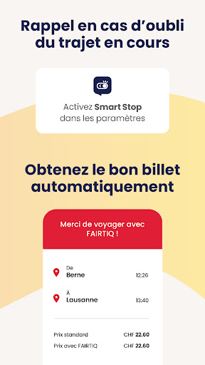 Grâce à FAIRTIQ, plus besoin d’acheter votre billet en avance, de préciser la station d’arrivée ou de vous prendre la tête avec le plan des zones. Le titre de transport le moins cher pour tous les trajets parcourus vous sera facturé, peu importe le nombre de fois où vous changez de ligne ou de moyen de transport. Comment utiliser FAIRTIQ Juste avant d\embarquer dans un véhicule, par exemple un train, un bus, un tram ou un bateau, glissez le bouton “Start” dans l\app FAIRTIQ. Pas besoin de saisir votre destination ! Lors d\un contrôle, appuyez sur “voir le billet”. Le code QR, qui représente votre titre de transport, sera scanné par le contrôleur. Lorsque vous arrivez à destination, glissez le bouton \Stop\ vers la gauche. Le prix de votre trajet est ensuite calculé selon la meilleure offre disponible. Mode compagnon: Grâce à cette nouvelle fonction, tu n\es pas le seul à pouvoir obtenir facilement un billet valable, tes compagnons de voyage le sont aussi. Rayon de validité Vous trouverez ici une vue d\ensemble du rayon de validité https://fairtiq.com/fr/passagers/rayon-de-validite Avez-vous encore des questions ? Notre équipe se tient à votre disposition pour toute question. Contactez-nous à l’adresse feedback@fairtiq.com.