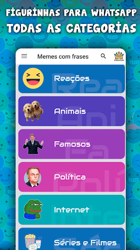 Adicione mais diversão às suas conversas no WhatsApp com o nosso incrível aplicativo de Figurinhas de Memes! Com uma ampla variedade de Figurinhas com frases engraçadas e animadas, este aplicativo é perfeito para qualquer pessoa que queira adicionar um pouco de humor às suas conversas no WhatsApp. Com o nosso app, você terá acesso a uma infinidade de Figurinhas para WhatsApp, incluindo WASticker Memes, Figurinhas Engraçadas, Figurinhas Animadas para WhatsApp e muito mais. Nossa interface amigável torna fácil encontrar e escolher as Figurinhas de Memes para WhatsApp que você quer usar. Você pode navegar por categorias, como Animais Engraçados, Personagens Populares, Citações Populares, entre outras. Além disso, o app é super fácil de usar - basta selecionar a Figurinha de Meme que deseja usar e adicioná-la diretamente à sua conversa no WhatsApp. Com este app, você nunca ficará sem opções de Figurinhas para WhatsApp. Temos uma biblioteca em constante expansão de Figurinhas Memes para garantir que você sempre tenha algo novo para adicionar às suas conversas. E o melhor de tudo? Nosso aplicativo de Figurinhas de Memes para WhatsApp é totalmente gratuito! Não há compras no aplicativo, nem taxas ocultas. Então, comece a adicionar um pouco de diversão e humor às suas conversas no WhatsApp com nossas Figurinhas Memes incríveis. Baixe agora e comece a adicionar suas Figurinhas Engraçadas e animadas ao seu WhatsApp!