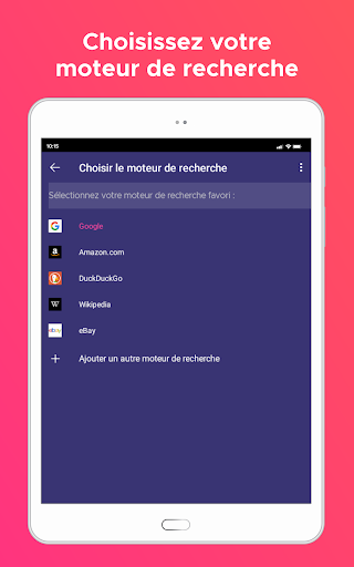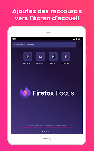Utilisez Firefox Focus pour tout ce que vous voulez garder séparé de votre navigateur principal. Pour tous ces moments où vous voulez vous connecter, vous déconnecter, et tout oublier. Pas d’historique, pas d’onglet, pas de problèmes. Bloquez également les traqueurs en ligne. Un simple clic, et votre historique de navigation est entièrement supprimé. Firefox Focus est le navigateur parfait pour vous connecter, vous déconnecter, rechercher et effacer. Parce que votre navigation ne regarde personne d’autre que vous. Un nouveau design anti-distractions Lorsque vous ouvrez Focus, vous voyez juste la barre d’adresse intelligente et le clavier pour une recherche ultra-rapide. C’est tout. Pas d’historique récent, pas d’anciens sites, pas d’onglets ouverts, pas de publicité, pas de distraction. Juste un design simple et minimal avec des menus logiques. Effacer l’historique en un clic Effacez votre historique, vos mots de passe et cookies d’un simple clic sur la corbeille. Créer des raccourcis Épinglez jusqu’à quatre raccourcis sur votre écran d’accueil. Accédez à votre site préféré encore plus rapidement sans avoir à taper quoi que ce soit. Une navigation plus rapide avec blocage des publicités et protection contre le pistage Firefox Focus bloque les publicités telles qu’elles sont normalement affichées sur les pages Web grâce à la protection renforcée contre le pistage, pour profiter d’une meilleure vitesse de chargement des pages, ce qui signifie que vous accédez beaucoup plus vite à ce que vous voulez. Focus bloque également un large spectre de traqueurs courants par défaut, y compris les traqueurs de réseaux sociaux, et les indésirables comme ceux des pubs Facebook par exemple. Soutenu par une organisation à but non lucratif Firefox Focus est soutenu par Mozilla, l’organisation à but non lucratif qui défend vos droits sur le Web, vous pouvez donc lui faire confiance pour ne pas vendre vos données.