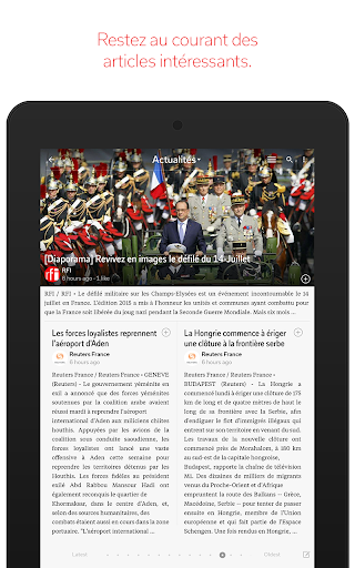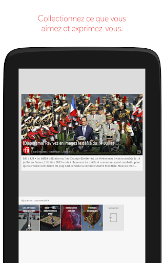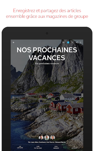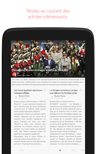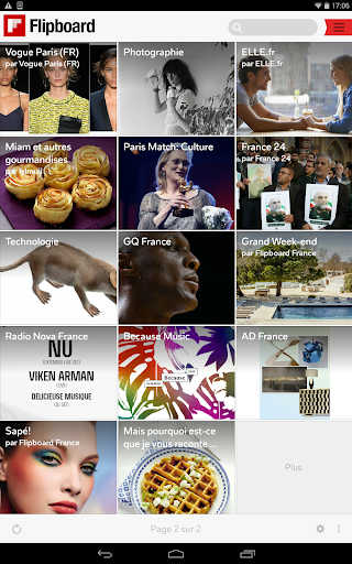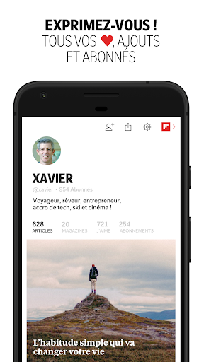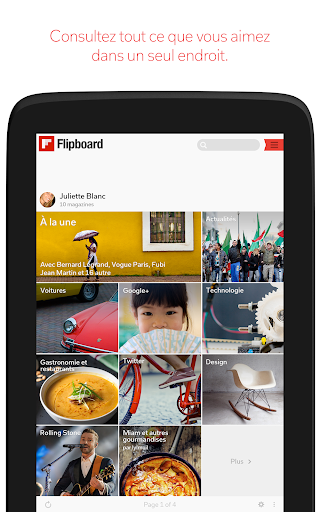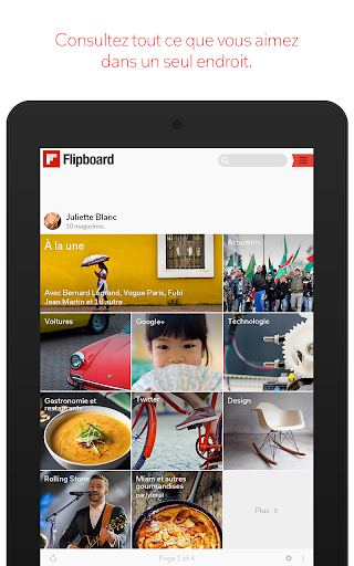 Utilisé par des millions de personnes tous les jours, Flipboard est le service primé qui rassemble actualités, articles populaires et conversation autour de tout centre d\intérêt ou toute passion. Grâce à sa centralisation, lire, collectionner et partager des articles n\a jamais été aussi simple ou aussi magnifique. Grâce à une variété de centres d\intérêts à explorer de personnes à suivre, il y a toujours quelque chose pour chacun. De la photographie aux actualités en passant par les voyages et la technologie au design et à la gastronomie. Téléchargez l\app, choisissez vos centres d\intérêt et Flipboard créera un magazine pour chacun d\entre eux. Vous pouvez aussi créer vos propres magazines personnalisés, en collectionnant tous les articles, images et vidéos que vous aimez. Vous pouvez rendre vos magazines publics ou privés et créer des magazines de groupes pour inviter d\autres personnes à contribuer à vos efforts. Au fur et à mesure que vous découvrez des personnes qui partagent vos centres d\intérêt, suivez-les sur Flipboard pour voir plus de ce qu\ils aiment ou partagent. Tous vos commentaires, partages et mentions j\aime rendent Flipboard meilleur pour tous. Téléchargez Flipboard et commencez dès aujourd\hui, c\est gratuit ! GRÂCE À FLIPBOARD, VOUS POUVEZ : - Accéder rapidement à votre top 9 des centres d\intérêt dans l\accueil. - Lire, aimer et partager des articles liés à une variété de sujets. - Suivre l\actualité quotidiennement grâce à l\Édition quotidienne, un condensé des articles importants que vous devriez découvrir. - Consulter les derniers articles sur les événements importants grâce aux magazines spéciaux conçus spécialement par notre équipe éditoriale. - Interagir avec d\autres membres de la communauté Flipboard qui partagent vos centres d\intérêt. - Collectionner des articles sur des thèmes spécifiques et les enregistrer dans des magazines personnels. - Lire des articles de Vogue, France 24, Paris Match, GQ France, RMC Sport et de nombreuses autres publications prestigieuses du monde entier. - Profiter de Flipboard dans 25 éditions quotidiennes, y compris celles pour la France, l\Australie, le Brésil, l\Inde et la Chine. Suivez Flipboard Pour des mises à jour et les dernières actualités de notre blog, dont des astuces sur la manière d\utiliser Flipboard et des interviews avec des acteurs, des musiciens et des écrivains et d\autres contenus intéressants, suivez-nous sur : www.twitter.com/@flipboard www.facebook.com/Flipboard https://www.linkedin.com/company/flipboard-inc- Pour des vidéos sur la manière d\utiliser Flipboard, visitez https://about.flipboard.com/tutorials/. Vos retours sont toujours les bienvenus. Envoyez-nous un message depuis l\appli dans Paramètres puis Aide et commentaires. Ou cliquez sur le bouton Contactez-nous sur flip.it/help.