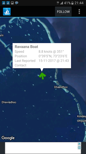 FollowMe Tracker is a real-time vessel, vehicle and personal tracking application. Features include: - Boat & Vehicle location updates upto every 10 second - Instant movement notification and other device status - Trip logs with date/time, arrival/departure location, distance travelled, time taken etc. - Trace route - Play route - Share your vehicle/boats with individuals (with selected permission) or with public - Create custom fleet - Estimated time of arrival - Over speed alert For more information, please visit www.followme.mv