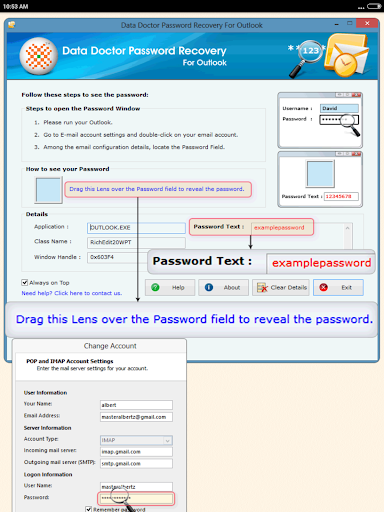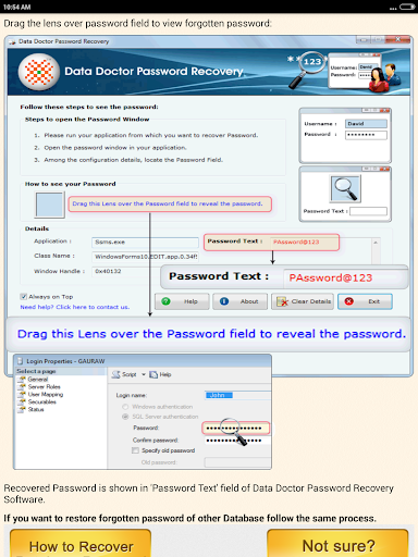 Forgot Password Recovery Help is free app that guides you to retrieve lost Passwords unmask & Reveal forgotten passwords saved in any windows based applications such as Email Clients FTP Server Clients Chat Messenger Database Software and Download Managers or Internet Browsers such as Internet Explorer Mozilla Google Chrome and Opera Etc. App has been tested in all popular Email clients such as Microsoft Outlook Dream Mail Incredimail EmailTray Pegasus Mail eM Client etc. If in your browsers you have any saved passwords of websites blogs web accounts and download upload portals etc, App also includes steps to retrieve saved passwords by decrypting the stars or Dots of passwords. App also recovers passwords saved with various databases such as MS SQL MySQL Oracle and various Sqlite database tools. App includes password recovery Help steps and procedures of following Editions of Data Doctor Password Recovery Products: * CuteFTP * SmartFTP * FileZilla * ALFTP * Quick \n easy FTP * BitKinex * FlashFXP * Classic FTP * eM Client * Pegasus Mail * EmailTray * IncrediMail * DreamMail * Microsoft Outlook and Outlook Express * Windows Mail * Trillian Messenger * mIRC * Free Download Manager * LeapFTP * Auto FTP Manager * zFTPServer * Ipswitch WS_FTP * FTP Rush * FTP Surfer * Core FTP * DAP ( Download Accelerator Plus ) * Fling File Transfer The app advises password unmask & Reveal steps to convert the password hidden behind asterisks or dots using respective Data Doctor Password Recovery Software for Windows. Data Doctor Password Recovery Software reveals saved passwords of all type of emails configured in all type of emails of all type of websites as well as Popular email services such as Gmail hotmail outlook yahoo AOL etc regardless you have configured POP3 SMTP or IMAP based settings over SSL TSL or standard authentication settings. Please be advised that it is just Documentation App for Data Doctor Recovery Apps and performs absolutely no such actions itself on any of your devices. It is absolutely safe.